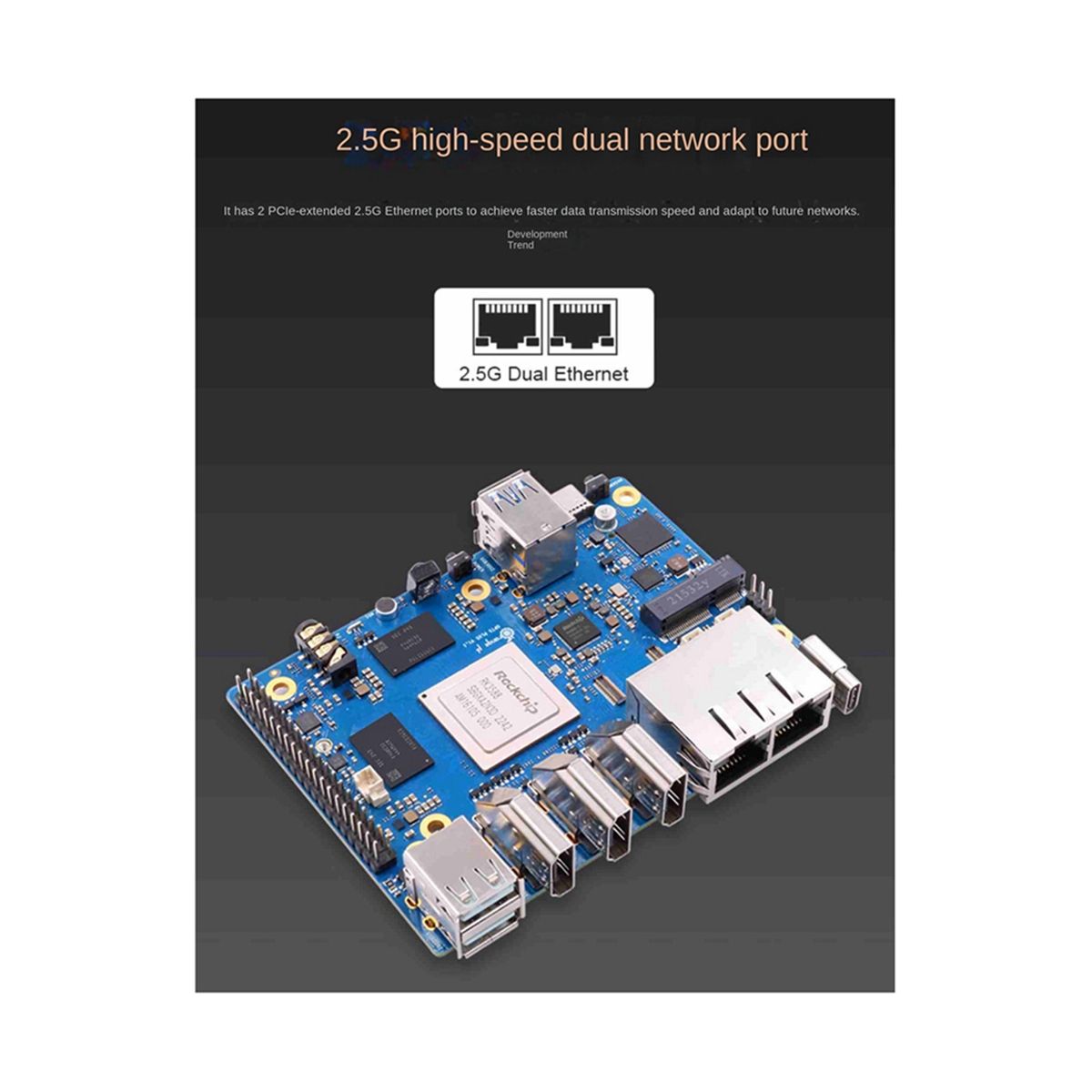 Support 8K video decoding 2566 B EMMC module 2.5G high-speed dual network ports can be connected externally.