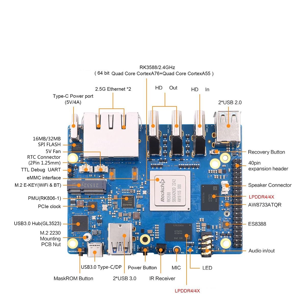 for Orange Pi 5Plus has rich interfaces, including 2 HDMI output ports and 1 input HDMI port, which can decode up to 8K@60P video, two PCIe extended 2.5G Ethernet ports, and is equipped with an M2 M- Key slot, an M.2 E-Key slot that supports for Wi-Fi6/BT module.
