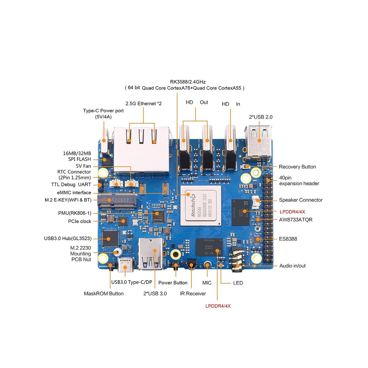 for Orange Pi 5Plus has rich interfaces, including 2 HDMI output ports and 1 input HDMI port, which can decode up to 8K@60P video, two PCIe extended 2.5G Ethernet ports, and is equipped with an M2 M- Key slot, an M.2 E-Key slot that supports for Wi-Fi6/BT module.