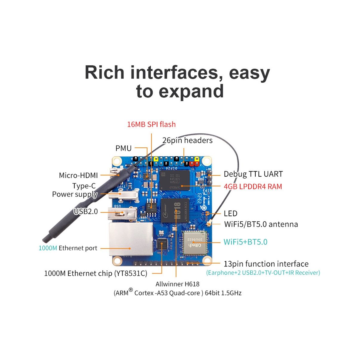 The Orange Pi Zero 3 Mini PC Computer can also extend the functions of headphones, TV-Out, USB2.0, and infrared reception through the 13Pin expansion port and adapter board.