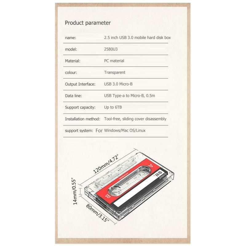 The appearance is designed as a vintage classic tape. Tool-free installation makes it easy to use. It uses SATA3.0 for main control and supports UASP acceleration protocol. With a USB3.0 Micro-B interface, it can transfer in of 5Gbps at most. It is compatible with 7-9.5mm 2.5-inch HDD/SSD. It can be connected with PC, laptop, intellegent TV, intellegent router. and so on.