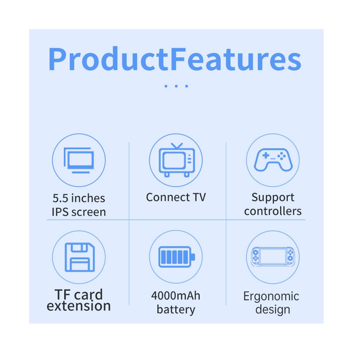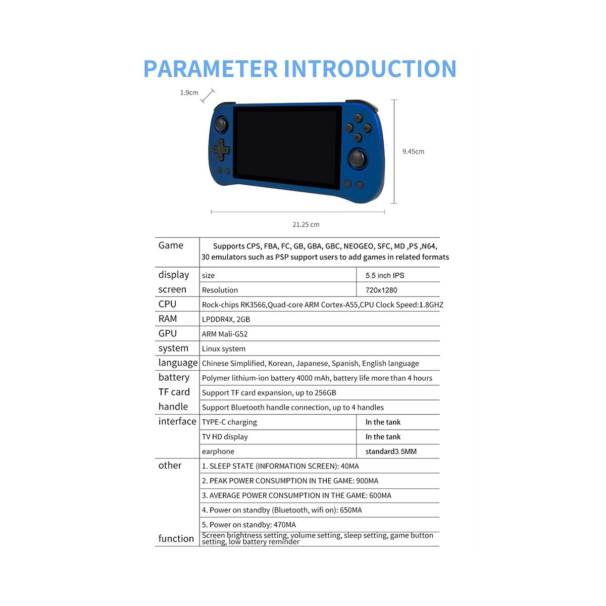 Other Features Support 3.5mm Stereo Headset, screen brightness setting, volume setting, sleep setting, game button setting, low power reminder, HDMI compatible video output