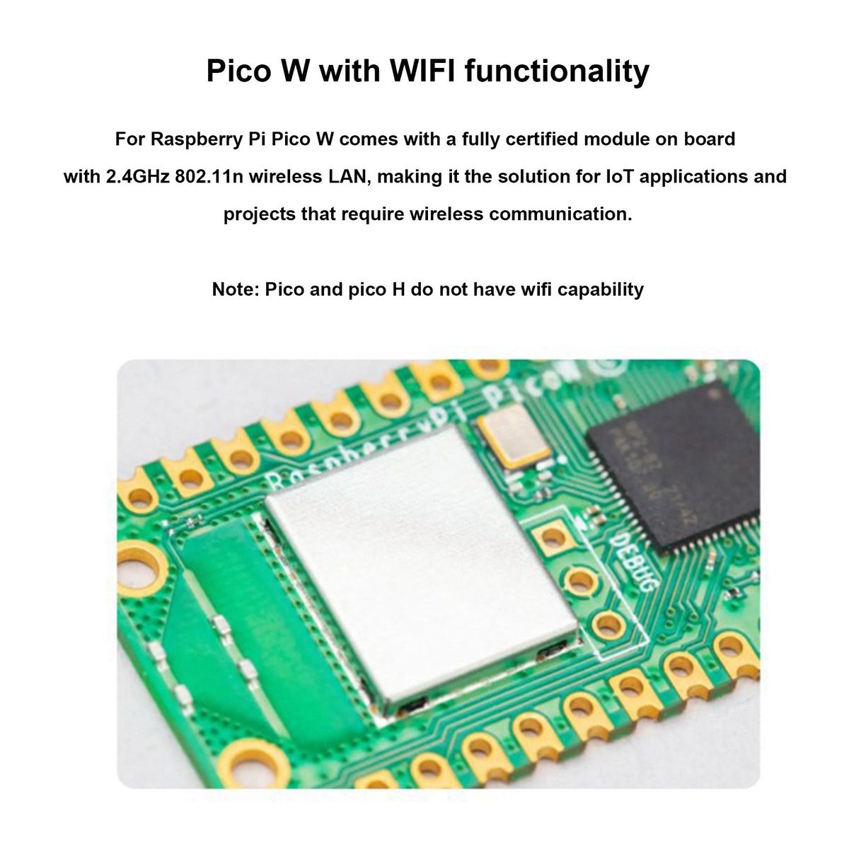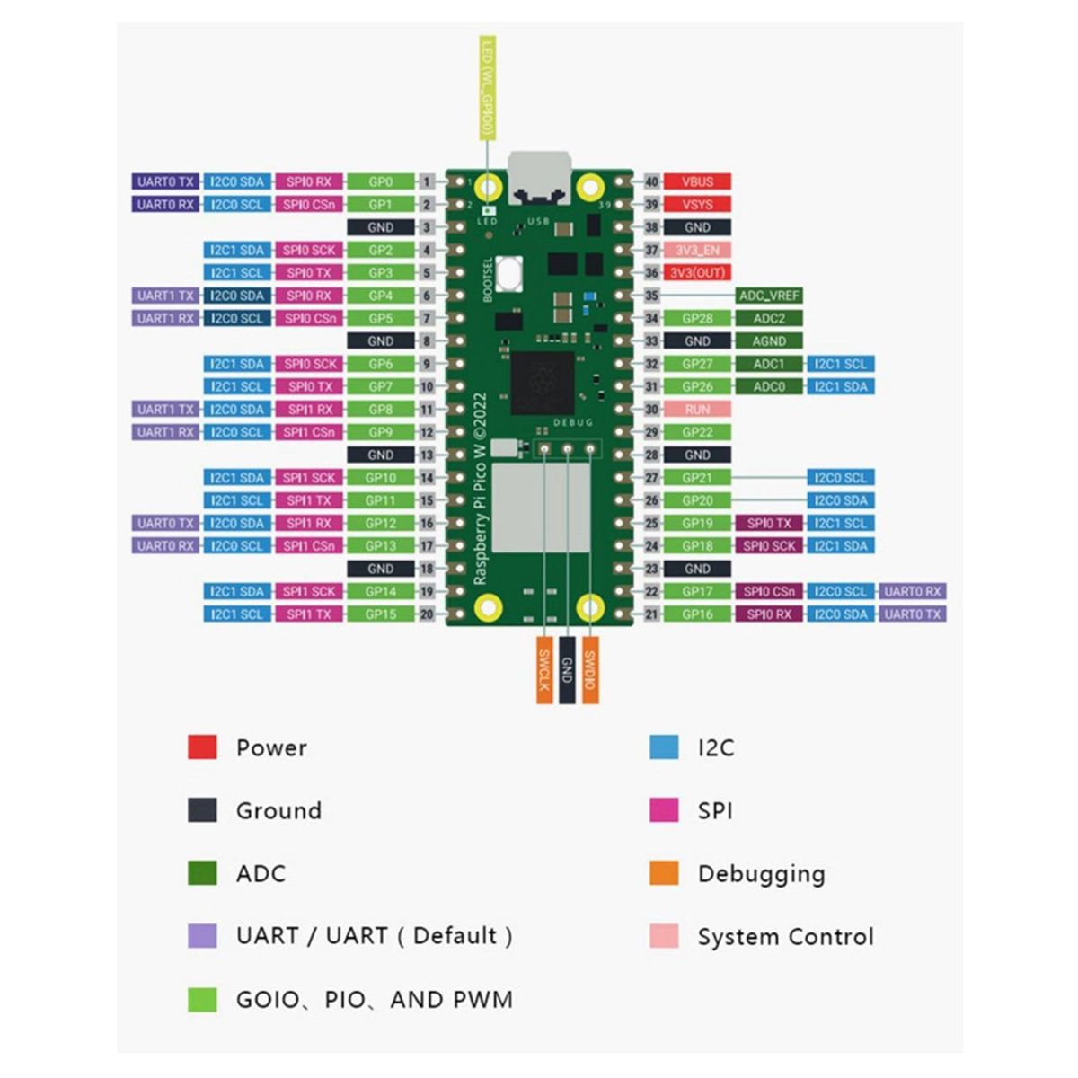 RP2040 microcontroller chip designed by Raspberry Pi in the United KingdomDual-core ARM Cortex M0+ processor, flexible clock running up to 133 MHz264kB of SRAM, and 2MB of onboard Flash memoryCastellated module allows soldering directly to carrier boardsUSB 1.1 Host and Device supportLow-power sleep and dormant modesDrag & drop programming using mass storage over USB26 multi-function GPIO pins2?SPI, 2?I2C, 2?UART, 3?12-bit ADC, 16?controllable PWM channelsReal-time clock (RTC)Temperature sensorAccelerated floating-point libraries on-chip8?Programmable IO (PIO) state machines for custom peripheral supportDimensions: 51mm x 21mm ()Raspberry Pi Pico AccessoriesWe have a great range of Raspberry Pi Pico accessories and add-ons available in our?! You can also read about?!