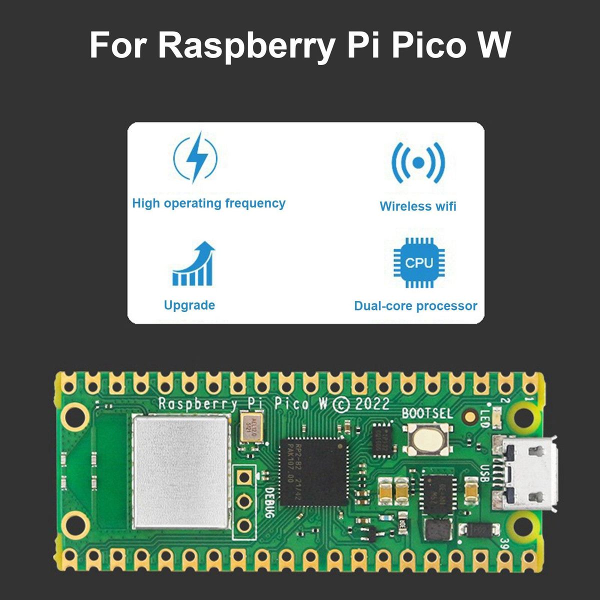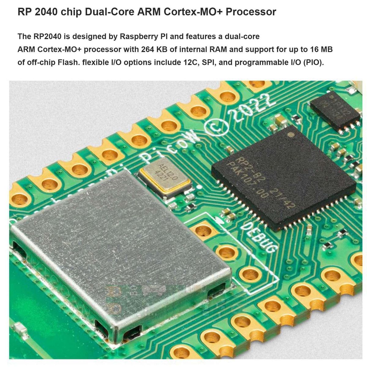Raspberry Pi Pico SpecificationsThe main chip on board is the 'RP2040' made by Raspberry Pi (their first in-house microcontroller chip!) and is a dual-core ARM Cortex M0+ processor, with a flexible clock running up to 133MHz.
