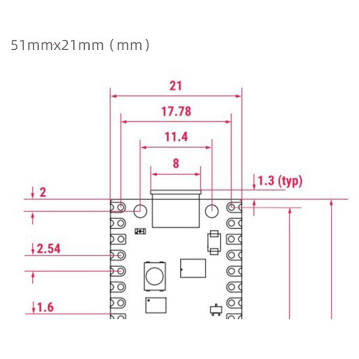 Pico has been designed to use either soldered 0.1" pin-headers (it is one 0.1" pitch wider than a standard 40-pin DIP package) or can be used as a surface mountable "module", as the user IO pins are also castellated. There are SMT pads underneath the USB connector and BOOTSEL button, which allow these signals to be accessed if used as a reflow-soldered SMT module.