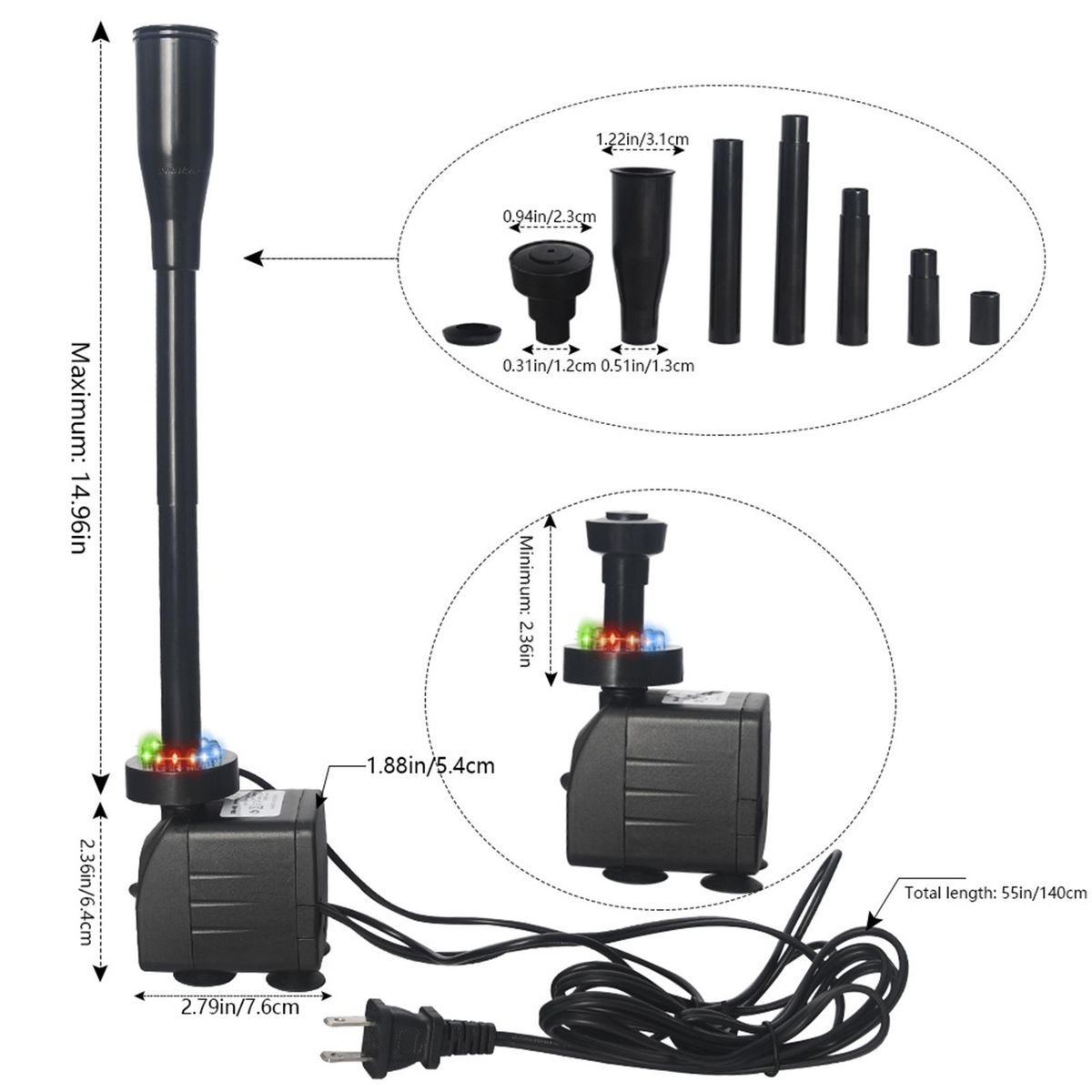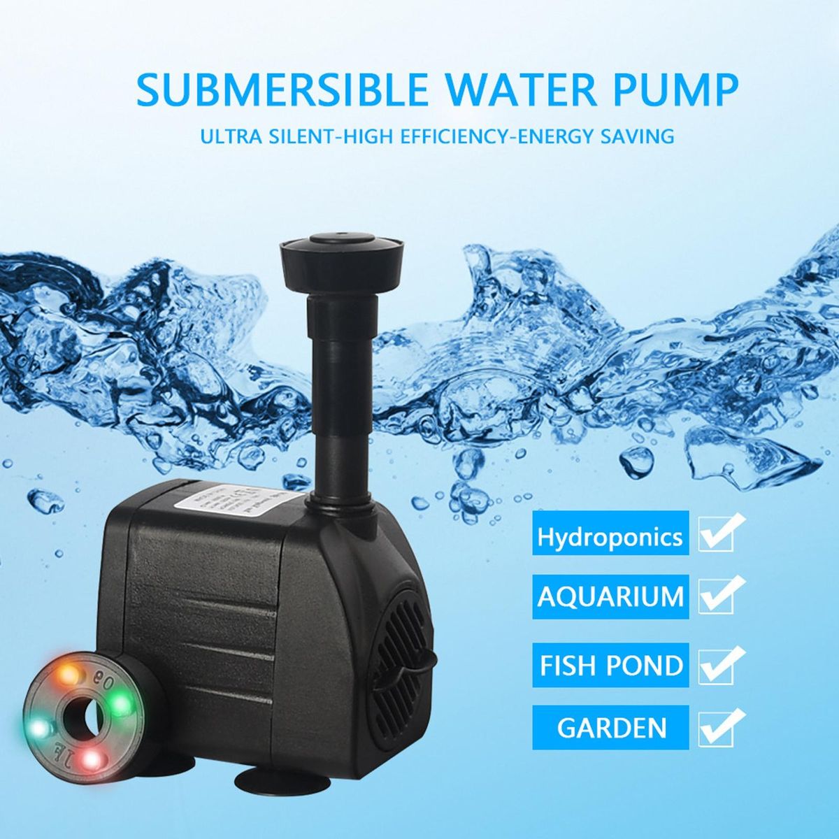 This fountainfeatures 12 energy-saving LED light beads with 4 colors (red, blue, green, yellow), which can make a decorative water feature lighting effect for gardens, patio, pond, aquariums, fish tanks, waterfalls, indoor and outdoor fountains.