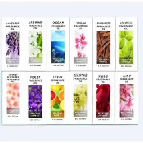 xperience the exotic bazaars of these fragrance oils . This Potpourri, humidifiers and Burner Oil is perfect for refreshing potpourri, use in tea light oil burners, humidifiers and other oil burners for that exotic, euphoric and luxe experience. 12 different fragrances 10ml each to be chosen at random from , rose, blueberries, ocean, lemon, lavender, violet, osmanthus, sandalwood, apple, lily , jasmine and vanilla fragrances.