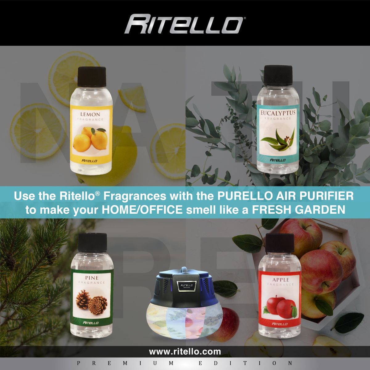 <p style="margin 0in 0in 0.0001pt; vertical-align baseline;">Ritello Fragrance (Set of 4 Bottles)</p><p style="margin 0in 0in 0.0001pt; vertical-align baseline;"></p><ol><li>Each bottle has a highly-concentrated oil based fragrances that can last for several uses.</li><li>Inside each Ritello Fragrance pack you will find 4 refreshing scents. Lemon, Apple, Pine, Eucalyptus.</li><li>Add a few drops of the Ritello Fragrances inside the water basin of the Ritello or the Purello and instantly feel the garden inside your home.</li><li>Made of pure oil essence.</li><li>Non Allergic.</li><li>Can be used in Both Ritello (Air Purifier and Indoor Cleaner) and Purello (Air Purifier with Inonizer).</li></ol> |