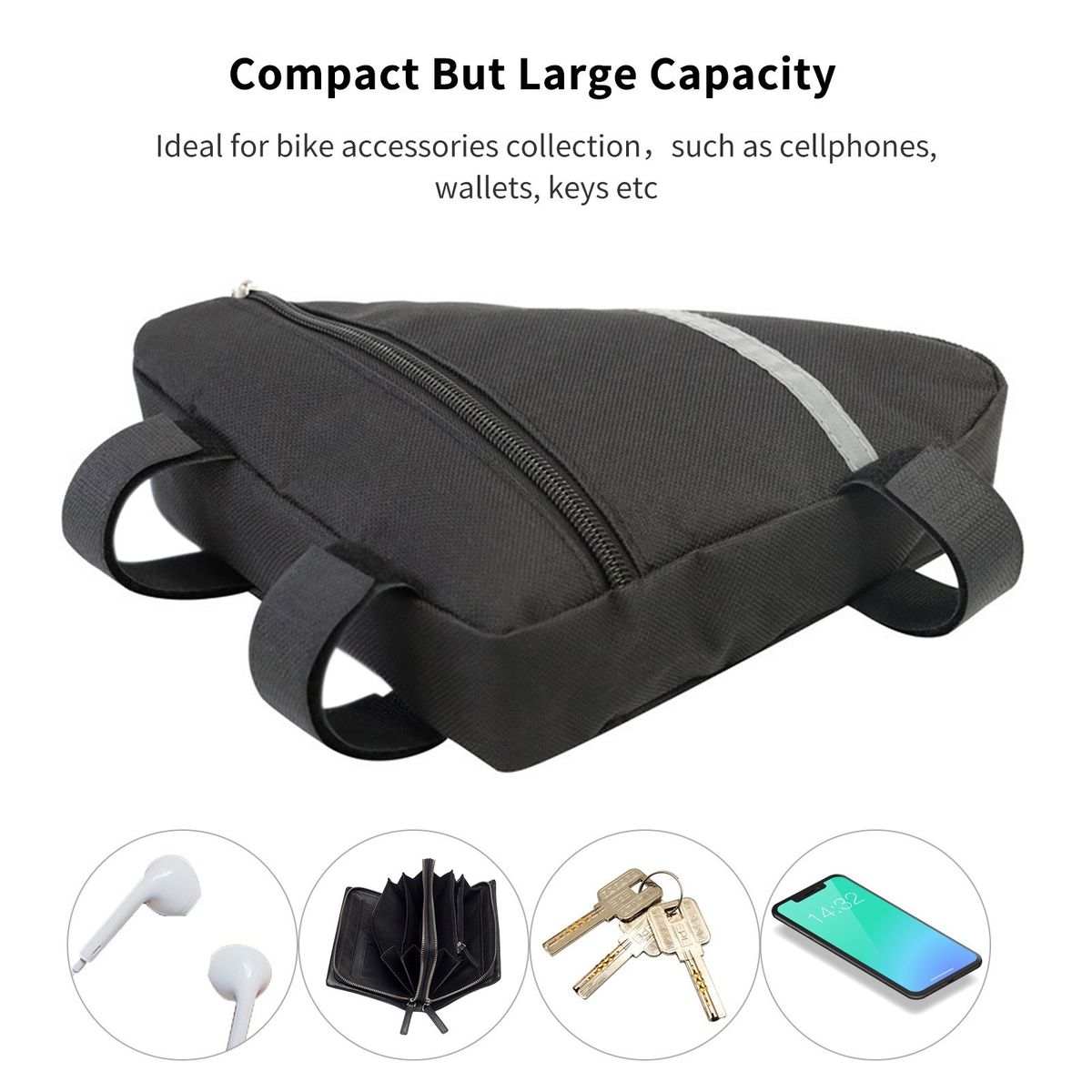 Compact but large capacity, ideally for bike accessories collection, such as cellphones, wallets, keys, etc.