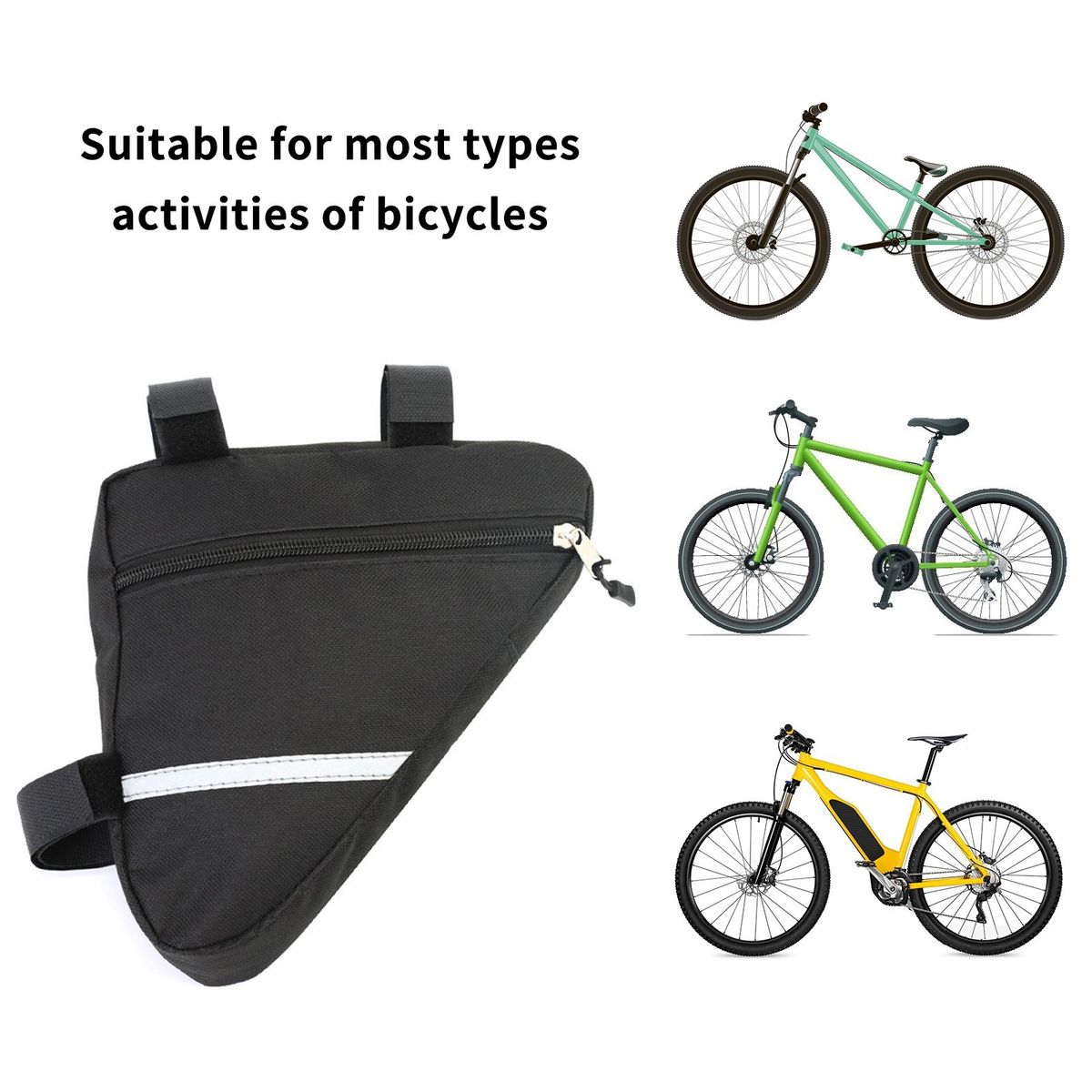 The triang-le bicycle bag can be fixed on your bicycle frame with fastener tapes.