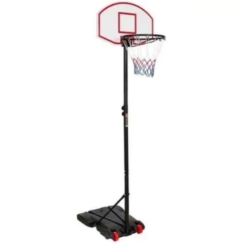 Movable basketball post with roller tires. It comes with components like board, ring and net. Suitable for both indoors and outdoor use, home use, schools, sport centres, recreational centers