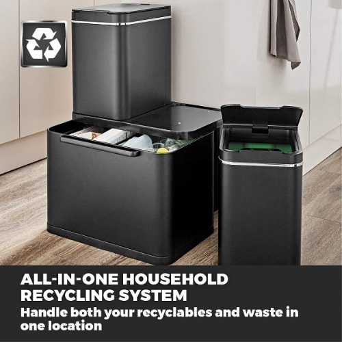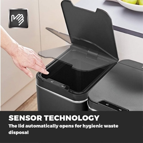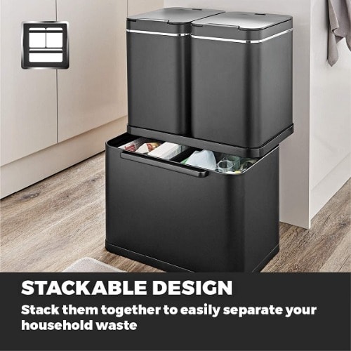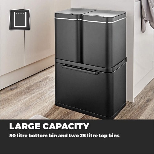 Combine the disposal of your household waste and recyclables with this elegant and compact 75 Litre recycling unit. Featuring hands free opening using motion sensor technology, you can dispose of household waste hygienically with one swift hand motion above the bin lid for automatic opening, complete with a soft-close function to minimise noise disruption. Alternatively there is a manual override should you wish to open and close at the touch of a button. The large 50 Litre waste compartment comes with addition of a small removable food caddy, which is included as standard for less mess during the disposal of foods. The lower 25 Litre compartment provides sufficient space for disposing of your recyclables, complete with a removable divider to easily separate your recycling needs.