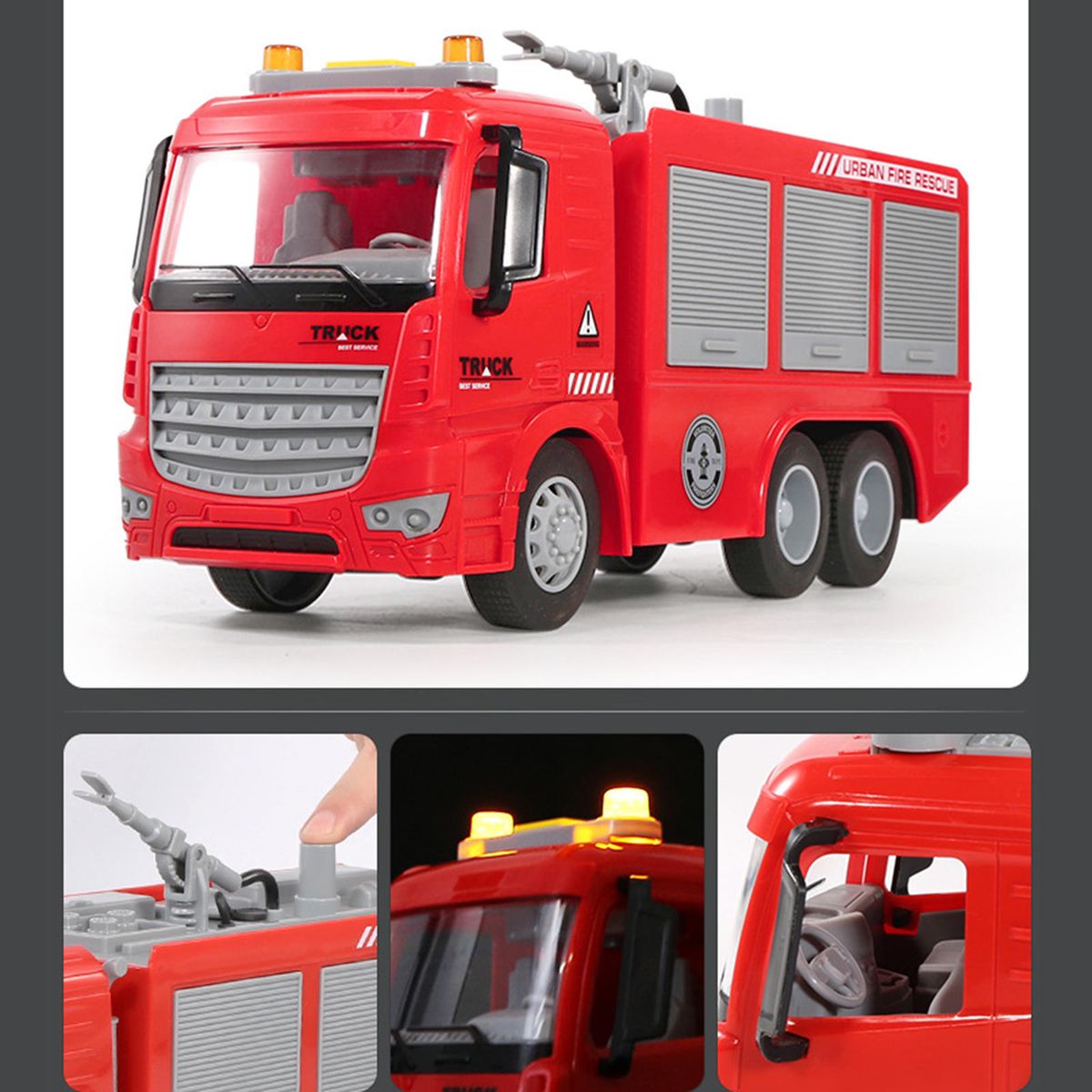 Fire engine truck, The great gift for boy and girl! Just wheelings forward, then watch the car accelerate across the floor. A fire truck toy will come with a lot and surprise to the