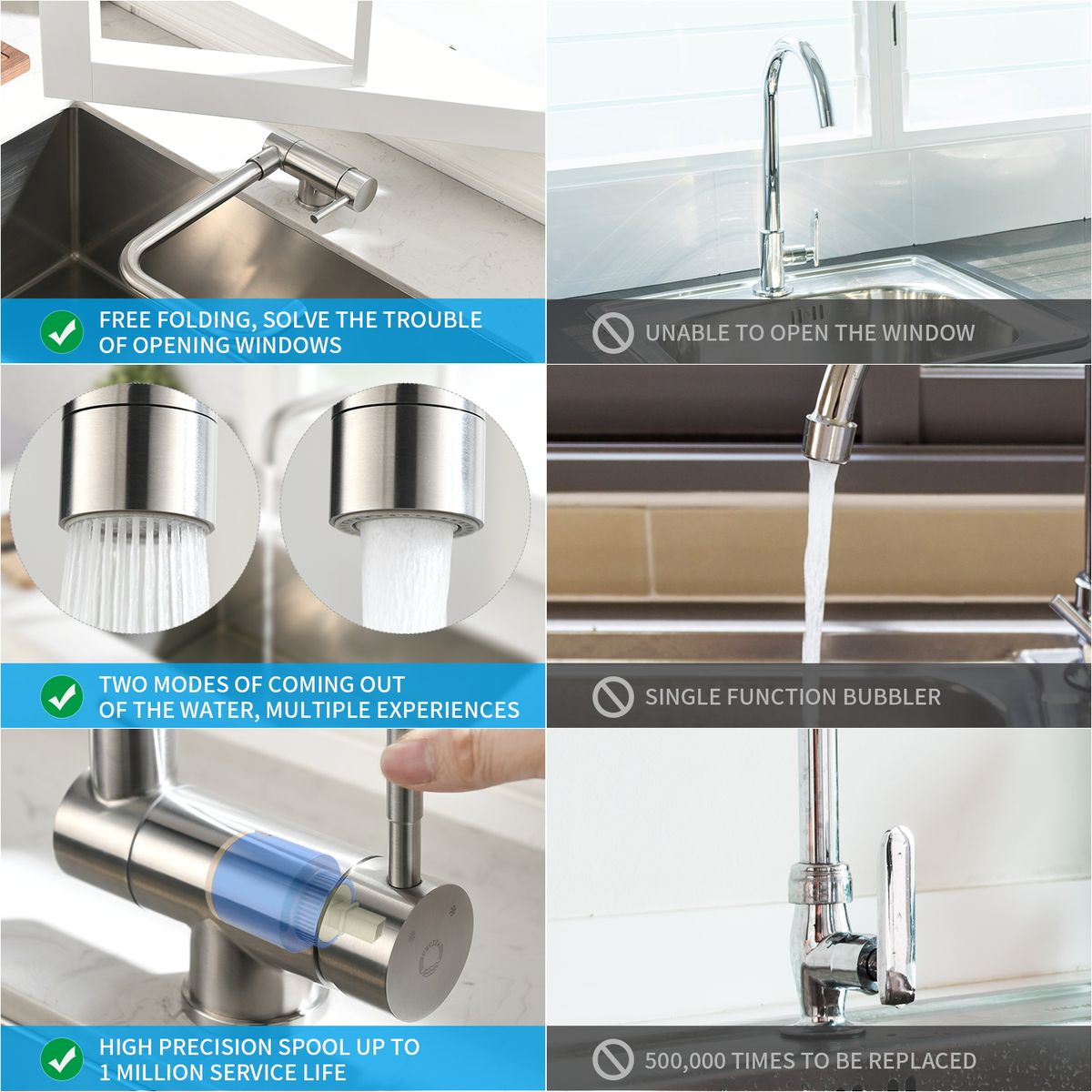 This Silver kitchen faucet can be rotated 360°, suitable for single sink and double sink. it can be folded back and forth 180 degrees, which can help you easily solve the problem of inward opening windows.