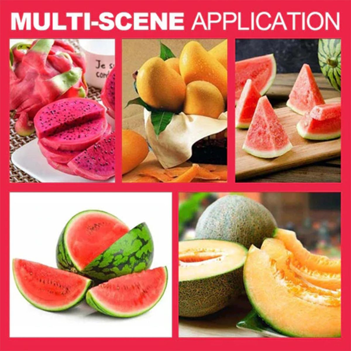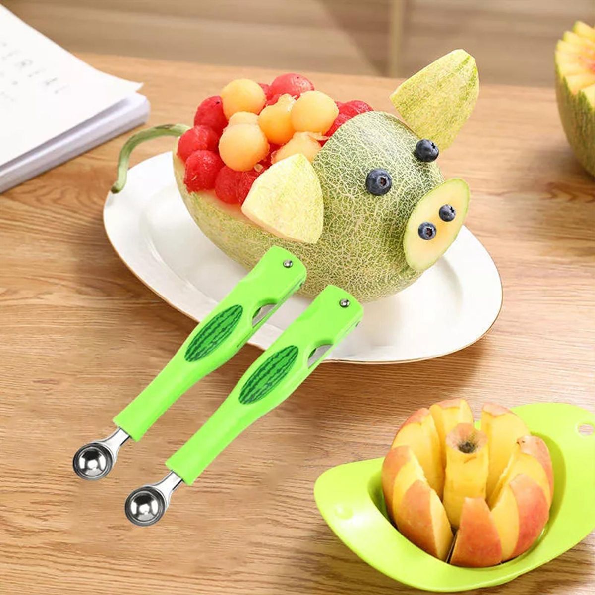 The watermelon divider adopts a three-in-one design, including a slicer, a spheres and a fork, which can quickly cut the watermelon into even pieces, making it more convenient to share watermelons with friends and family.