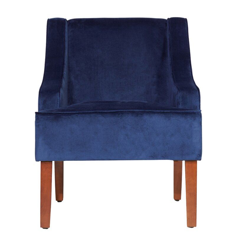 A contemporary update on a classic design, this charming swoop armchair lends a touch of tailored appeal to your seating ensemble. Made with a solid hardwood frame and iron hardware, this lovely design is draped in velvet upholstery with foam cushioning and handsome piping, and showcases swooping recessed arms and four tapered square legs.