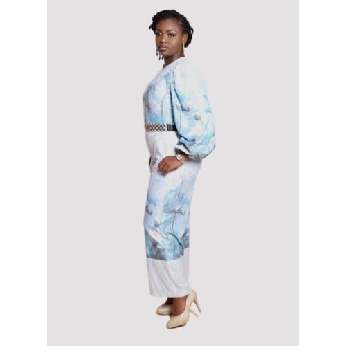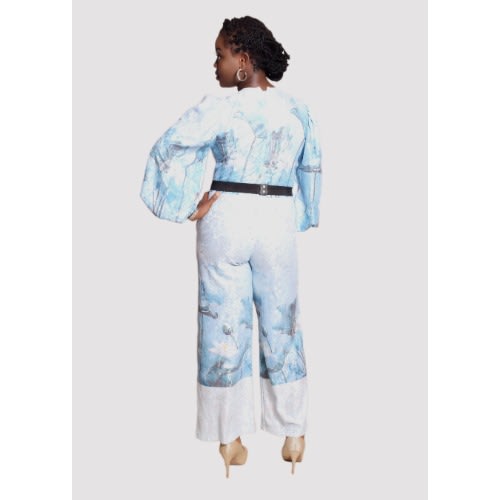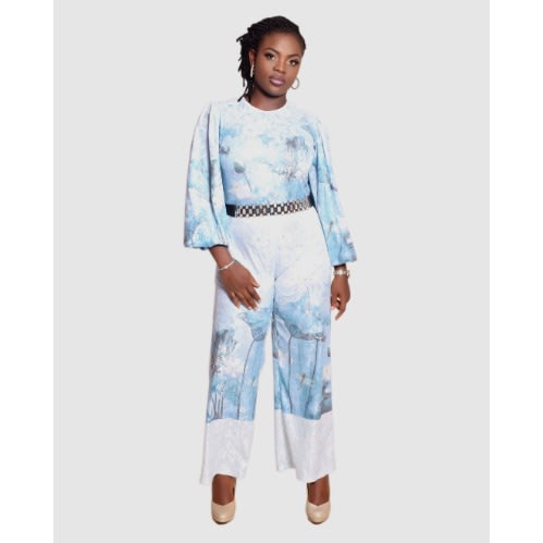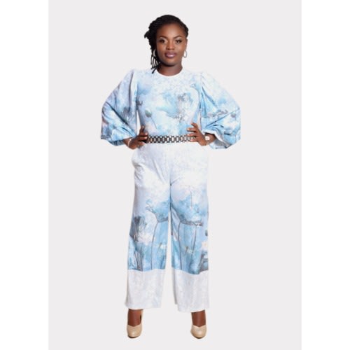 Jumpsuit with a difference. this jumpsuit is just right for every woman and for every occassion from formal to casual. it features an artsy flower print , semi palazzo leg cut,a full semi ballon sleeves and two side pockets.