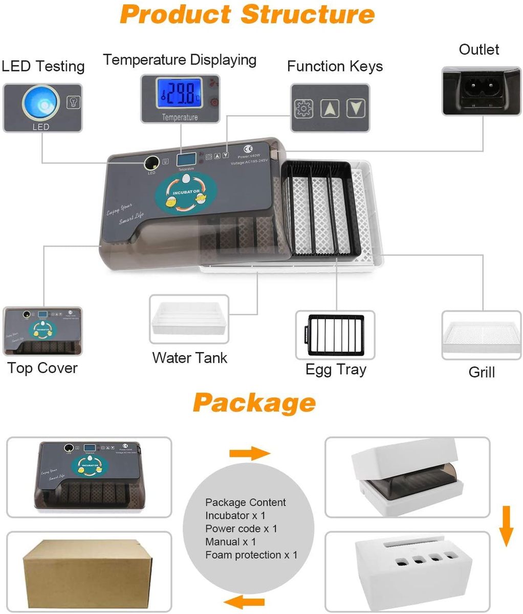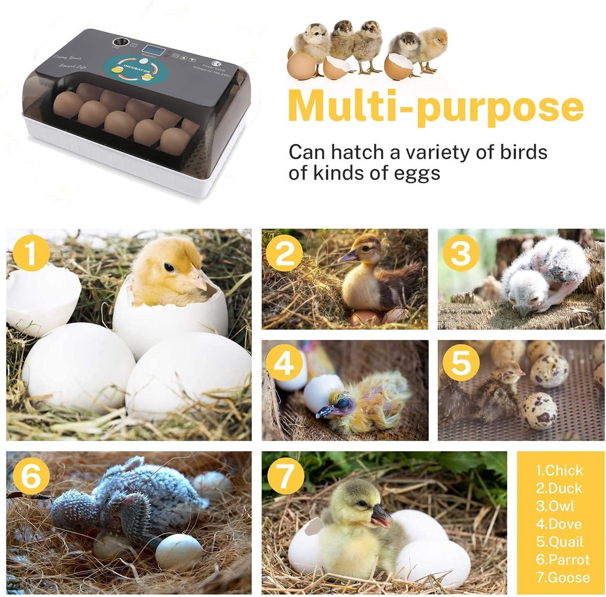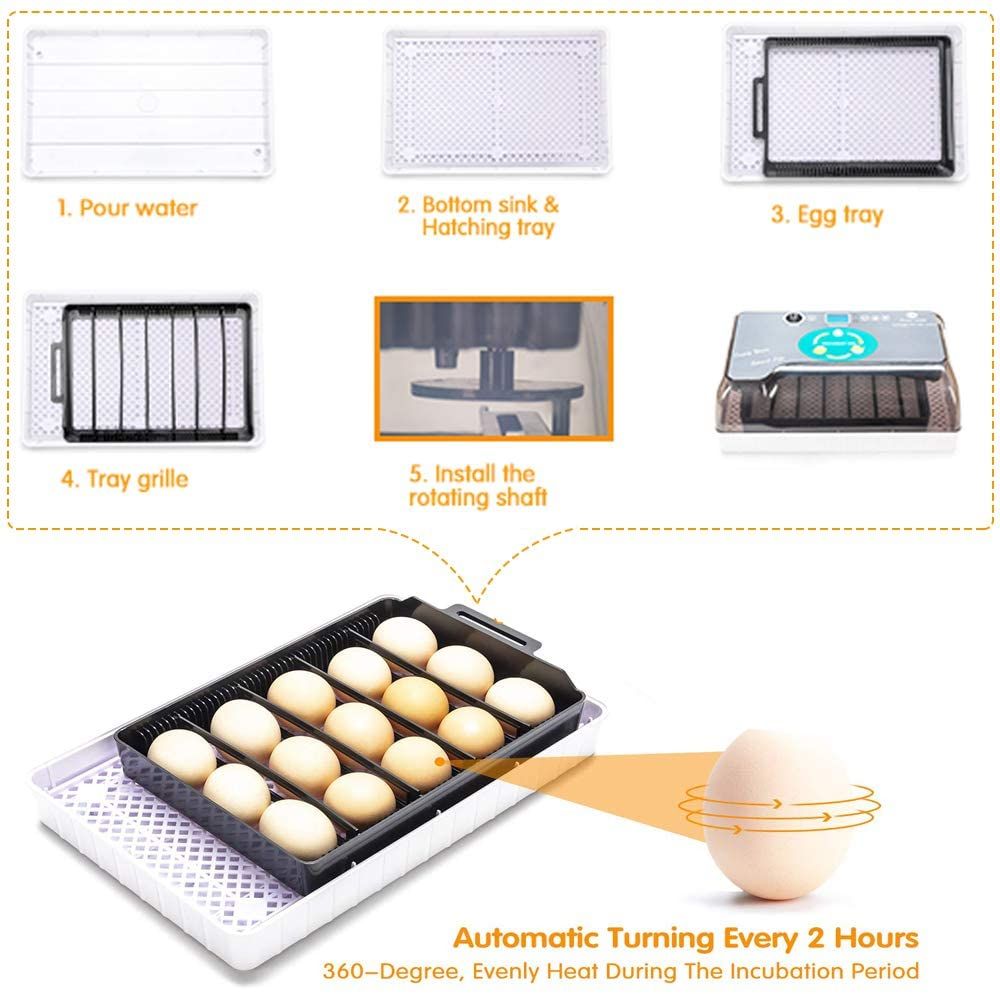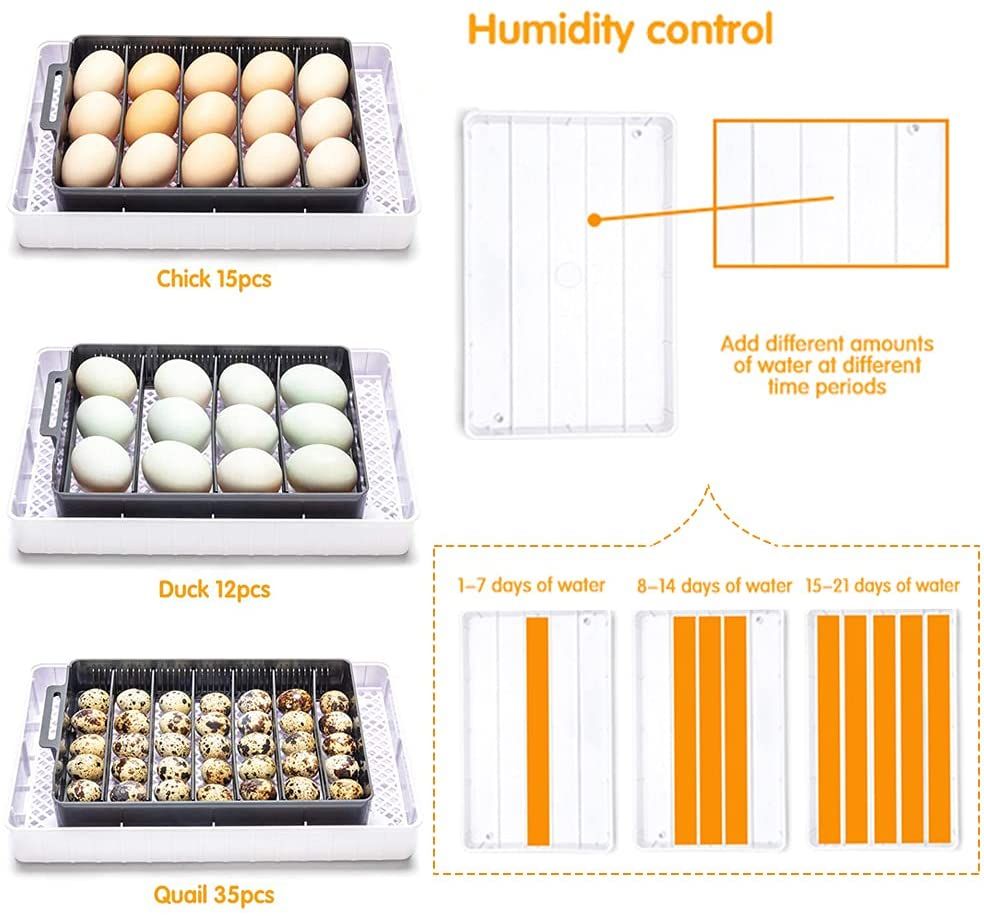 Product Description:Egg Incubator With Temperature Control & Automatic Egg Turner, LED Candler for chicken eggs, duck eggs, Quail eggs, pheasant eggs, guinea fowl, owl eggs, etc.INDUCED AIRFLOW:Sailnovo egg incubator provides optimal air circulation & temperature stability.AUTOMATIC EGG TURNER: Eases the incubation process and helps stimulate hen hatch for higher hatch rate.ADJUSTABLE SPACE SETTINGS:Can hold 12 duck eggs, 15 eggs, 36 quail eggs