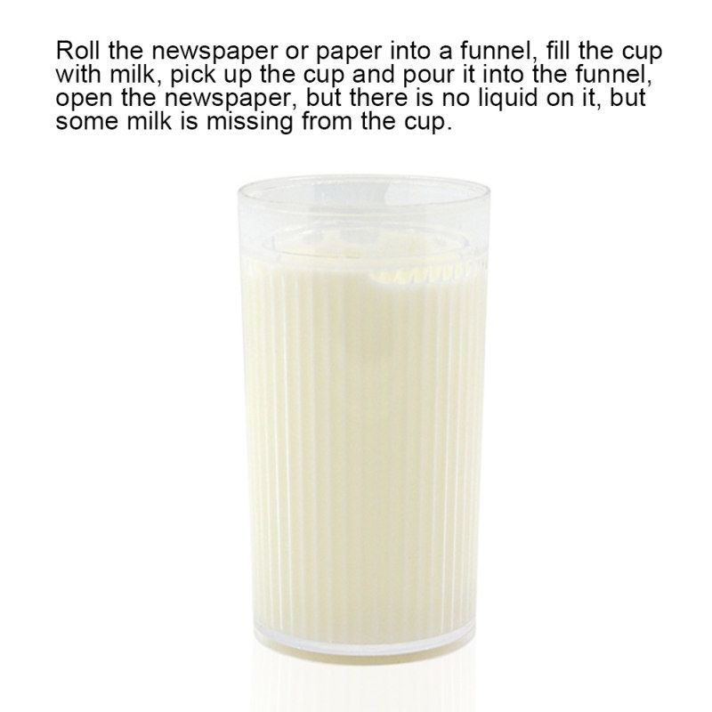 The magician takes a glass of milk and pours it into a paper cone.