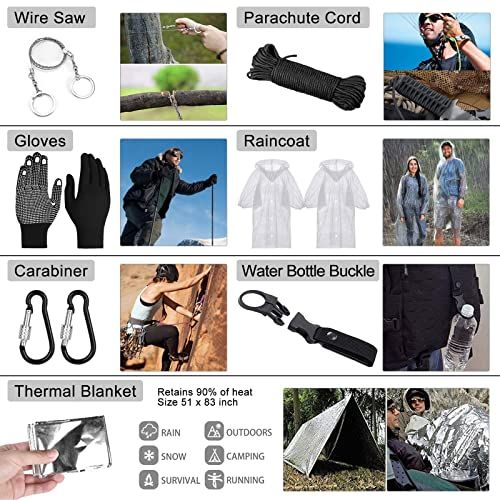 - Top Quality Tatial Tools: We upgraded a very omprehensive top quality survival kit, added a waterproof mobile phone pouh and an outdoor tent light (not inlude battery) . In addition, there are 15 in 1 Multifuntion Axe, 12 in 1 Saber Card, 4 in 1 ary Shovel, 4 in 1 Camping Utensil, 4 in 1 Survival Braelet, 4 in 1 Tatial nif, 2 Sets of Fishing Kit, Flashlight(not inlude battery), Rainoat, Gloves and more in the kit, whih an meet your different needs.
