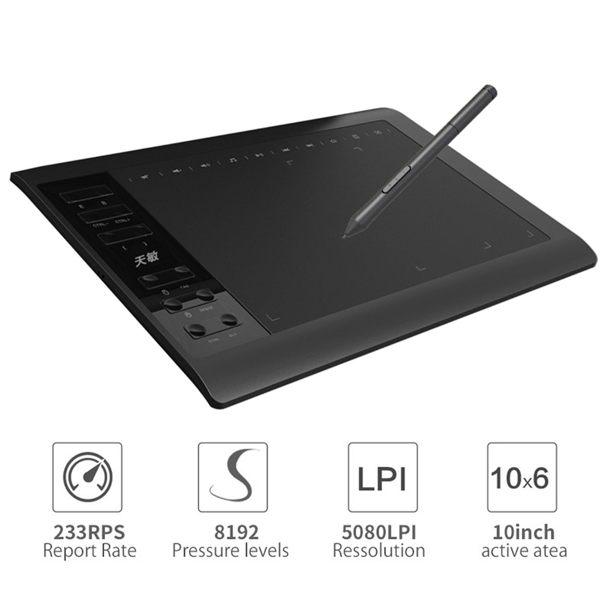 Features: - [Perfect Design]--Large Active Area Drawing Area: 10 x6 inches (240x145mm), active drawing space with papery texture surface, provides enormous and smooth drawing for your digital artwork creation, offers no-lag sketch, painting experience. Pen Touch Resolution:5080 LPI; Report Rate:233PPS; Sensing Height: 7mm.