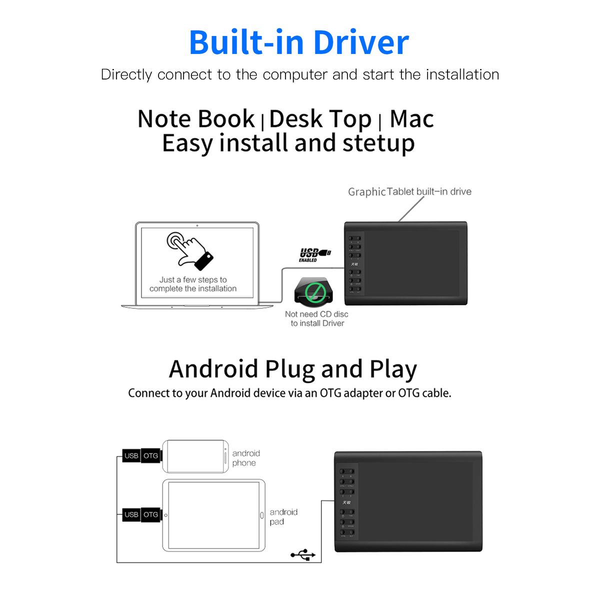 - [High Performance]--Graphics tablet built-in driver, directly connect to the computer and start the installation. Android phone, tablet drive free technology, plug and play, no computer can also work easily.