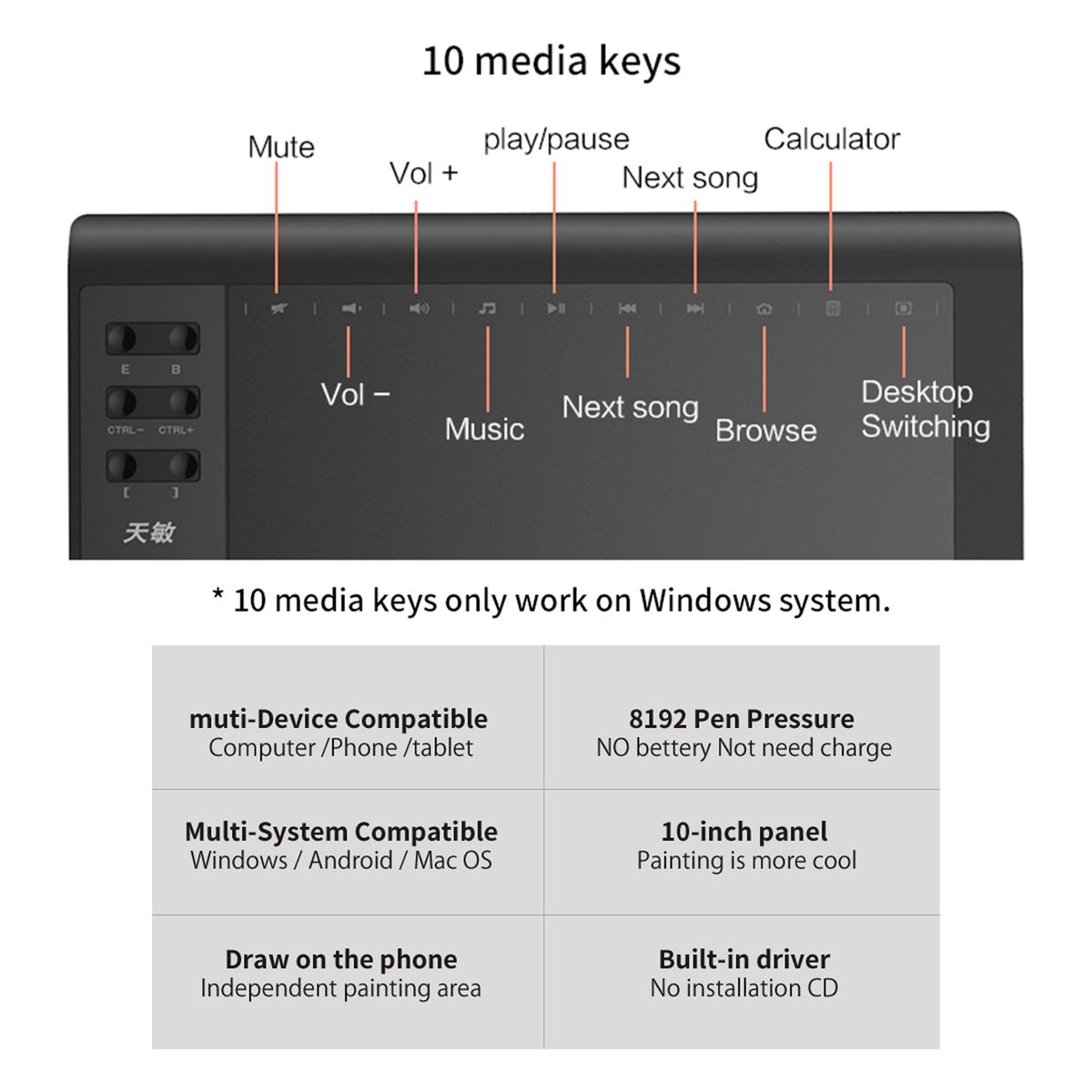 - [10 Shortcut Keys]--10 express keys put your favorite shortcuts to provide a lot more for convenience and helps to improve the productivity and efficiency when creating with the drawing tablet.