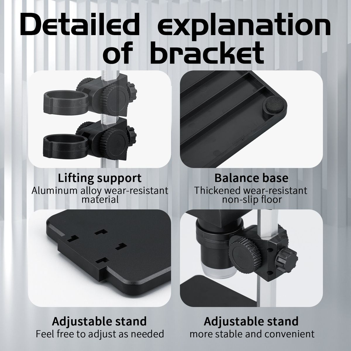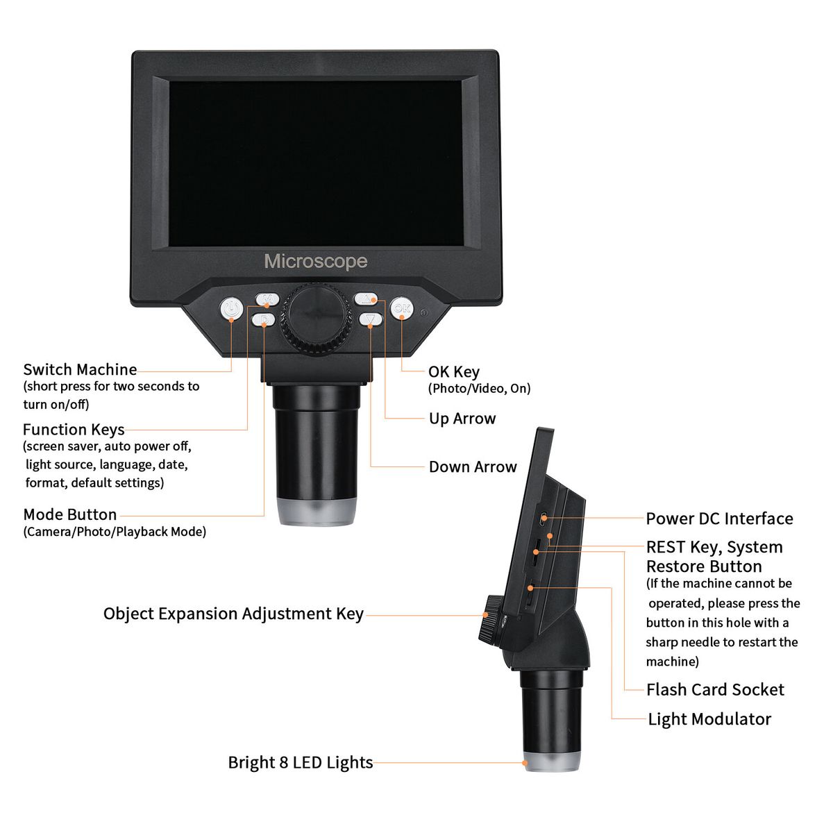 1:Focusing wheel, adjust the sharpness of the image by rotating left and right.2:The keys are clearly engraved, and the smart keys can be switched at will.3:Memory card slot, support SD card storage function.4:LED adjustment knob, adjust the light by turning left and right.5:10-100mm adjustable focal length to meet the needs of different scenarios.