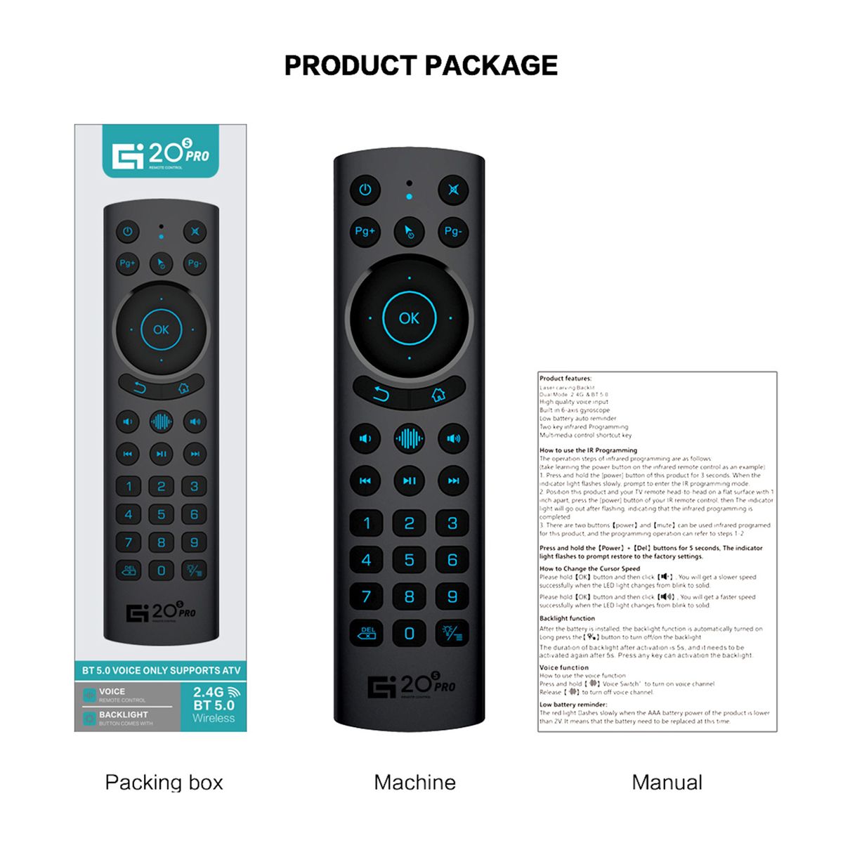 2.4GHz 6-axis air mouse, plug and play, simple and smooth, you can snuggle on the sofa and enjoy long-range wireless control up to 10 meters. It supports voice control. It can provide people a unique and capable tool to operate their PC, smart TV, Android TV Box, the set-top box simply by moving it directly in the air.