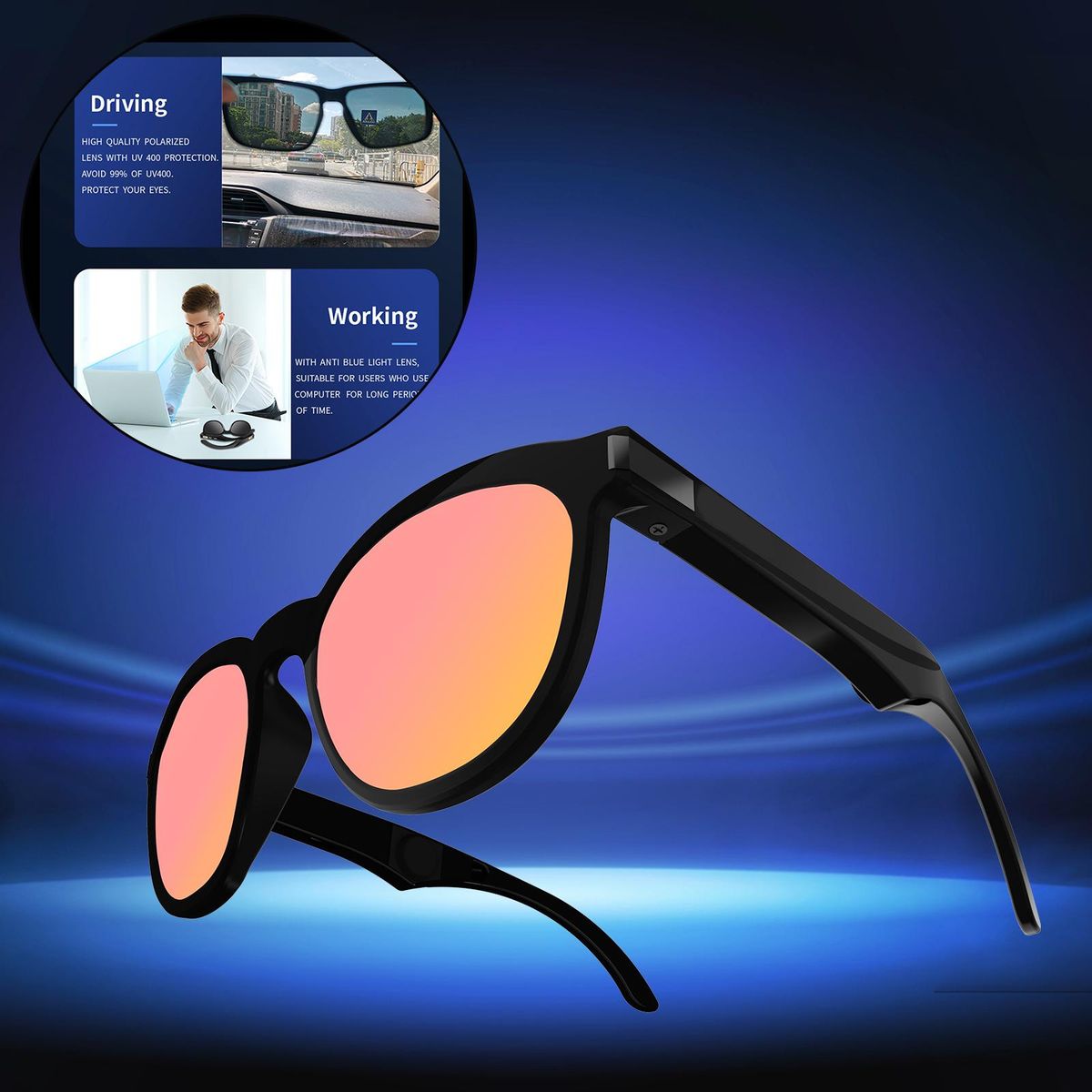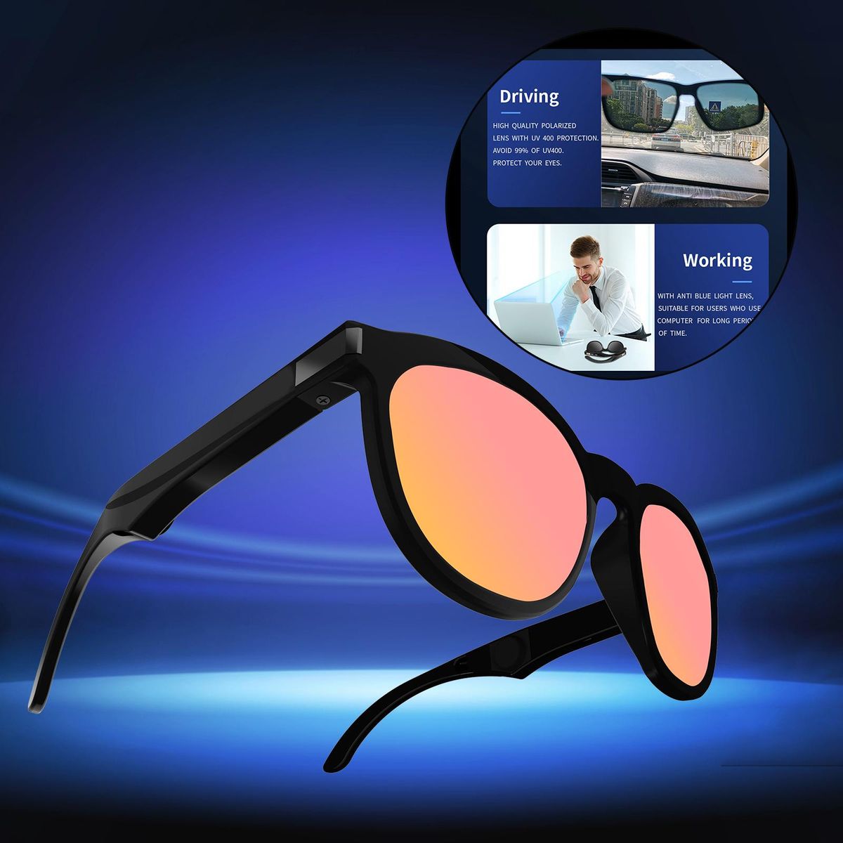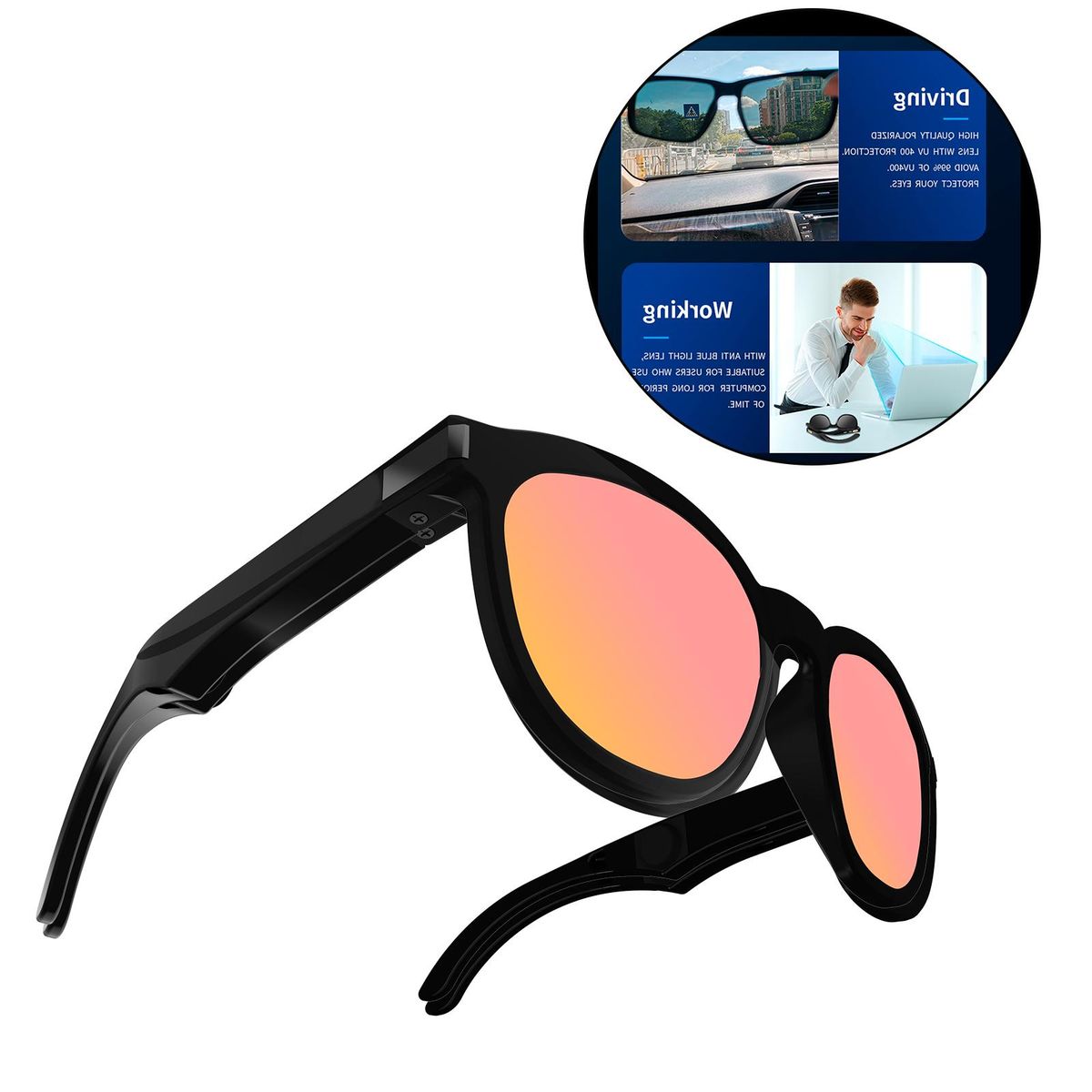 Smart Glasses, Not only glasses, but also a headphone. Good helper for outdoor activities such as riding, driving, fishing, etc.