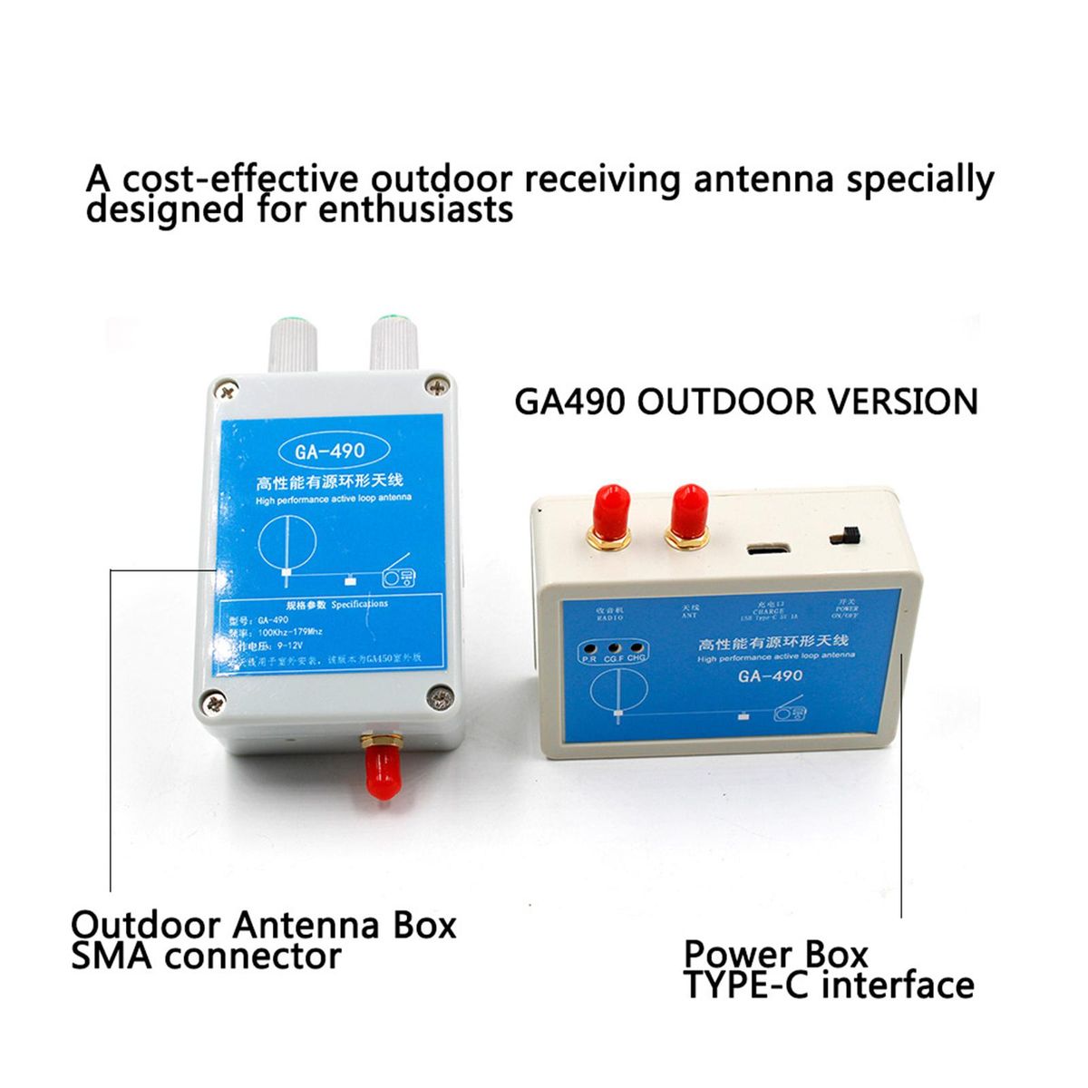 Complete Protection Circuit: GA490 Active Loop Broadband Receiving Antenna has a complete protection circuit for anti- battery, over discharge, over charge, over current, and antenna terminal short circuitWith numerically-precision processed shells, PCB high-frequency design, feeder high-density dense copper pure copper 50-1.5 feeder, materials used Create an high cost-effective antenna for the entire network.Built-in 3.7V 18650 flat head lithium battery. No external power supply required. The USB charging port is compatible with 5V charging plug and charging cables of Android phonesHigh-performance outdoor active loop antenna--radio / reception.Outdoor Antenna Box SMA connector. Power Box TYPE-C interface