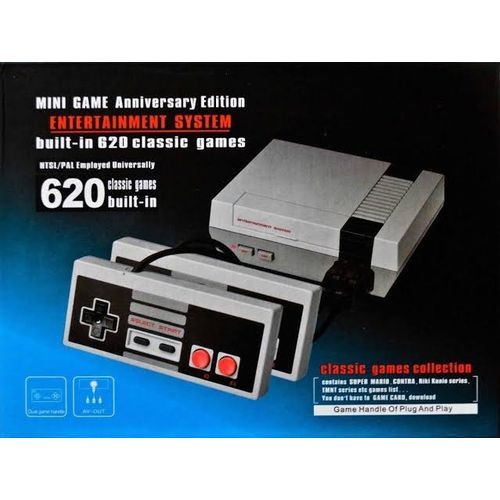 The Mini Game Anniversary Edition Entertainment System model HST-838 is a plug-n'-play Famiclone based on the NES Classic Edition. It appears to be made in China for the North American market, but no company name is apparent on the system or packaging. The case resembles the one-off NES Mini (NES Classic Edition), but the Power and Reset button functions are swapped and the controller ports are swapped. The system includes two NES controller bootlegs with 2-meter cables and DB9 connectors like Sega Master System controllers. The system is powered by a mini-USB adapter and outputs composite video and mono audio through a 3.5mm TRS jack.Mini Game Anniversary Edition lacks a cartridge slot but has a built-in 620-in-1 multicart containing MMC3 games, mapperless games, and games from Nice Code Software. None of the included games have save features or light gun support. Nearly all non-Hudson games have their publisher names removed. The system boots up to a language select menu for Chinese or English, then moves on to game select. The Chinese game select has a different background, different music, and does not key repeat left/right where the English game select does.A few games are made unplayable due to their backgrounds not updating correctly on this Famiclone. The NES's triangle sound channel is noticeably silent in some games.Ever wanted to play retro games from the past and don't want to pay a lot of money for the retro consoles out there? Well now you can with this mini edition console! It holds about 620 retro classics such as Pac-Man, Contra, TMNT series, and many more. The games are already pre-loaded in so you don't have to download any extra games or buy them. Please note that the video connection uses composite video, HDMI converters might be needed depending on your TV.