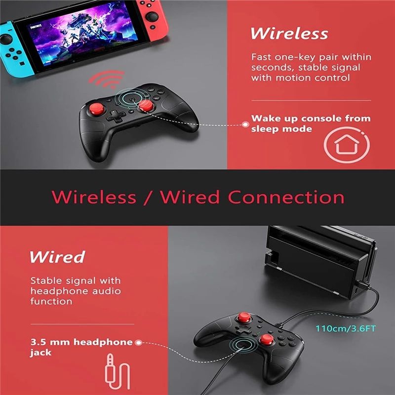 Vivefox Switch controller has a classic Black-red in color, specially designed for Nintendo switch/Lite, which can be easily paired with Switch/Lite. It is suitable for playing various games and supports almost all Switch / Switch Lite games! It supports auto-awake and pressing the "HOME" button to wake up your game console in wireless mode.