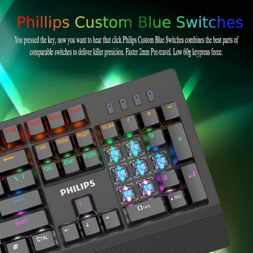 Philips USB Mechanical Gaming Keyboard & mdash; RGB Ambiglow, High-Performance Blue Switches | Custom Backlit Keymaps, N-Key Rollover | Windows, Linux, Mac OS & Gaming ConsolesThe name you know & mdash; for over 120 years, Philips has been a leading name in consumer electronics, trusted all over the world. That legacy of quality design and stunning functionality continues with this wired mechanical gaming Keyboard streamlined for speed and precision.