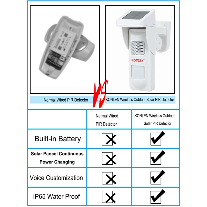 Pre LOCK key on remote, activate the motion detection and voice warning, pre UNLOCK key, deactivate it when you don't need. Solar panel adjustable According to different altitudes area and actual envment, solar panel can be rotated and adusted to get max sunshine. Audible and visual alarm Audible and visual alarm Pet immunity: 25kgs Max, can effectively prevent false alarms caused by pets. Package Content: 1pc Solar PIR outdoor PIR detector, 2pcs remote controllers (Battery, bracket, screws, manual included) Parameter: Battery size: 3.6VDC AAA lithium chargable battery Power consumption: stand by:20uA; alarm:85mA Warm up time: 50s Installation height:1.8m.-2.4m Alarm period:2s Alarm LED: High light red/blue led Audio output:90db at 30cm RFI / EMI protection:0.1-500MHz/3v/m Anti- light interference:>10000LUX Low battery alarm: below 2.9V Temperature compensation: Digital Operating temperature:-30℃/+50℃ Operation humidity(RH):95% Sensitivity:2P/3P Optional Detection speed:0.2m/s to 3.5m/s Size:210*80*190mm Anti fire: Flame-resistant ABS material Detection range:12m*12m 110° Pet immune level: 25kgs Max