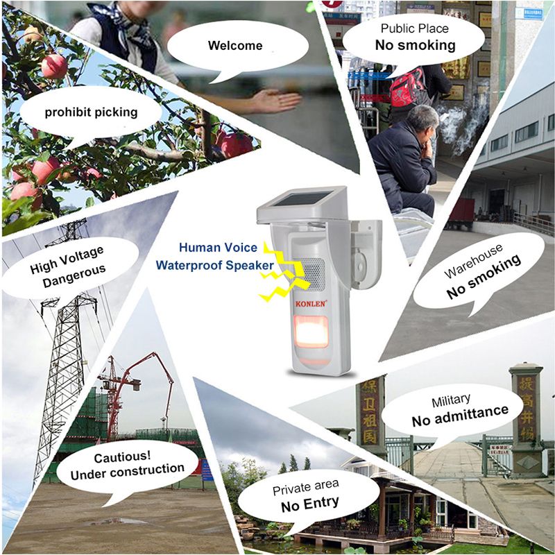1. Used in Forest for fire prevention Can broadcast pre-recorded voice" No and no fire, thanks" when detect human movement. 2. For private residence protection Can broadcast pre-recorded voice" Private area, no trespaing" when detect human movement. 3. Used for ZOO Protection It can broadcast pre-recorded voice" Watch out! No touching! " when detect human movement. 4. Used for water dam prompt It can broadcast your pre-recorded voice" Watch out! Deep Water " when detect human movement. 5. Used for high voltage warning It can broadcast your pre-recorded voice" Keep away! High voltage area" when detect human movement.
