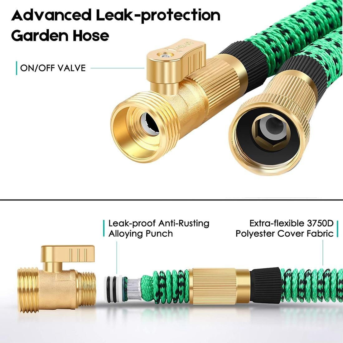 [ POLYESTER FABRIC COVER]: The expanding water hose uses a high-density double-layer latex core and a powerful polyester fabric cover to prevent breakage and leakage. It can withstand water pressure 3-12 Bar and temperature 41℉-122℉(-20℃-50℃)). This flexible garden hose for long-term use. You don't have to worry about the water pipes broken by the pressure of the water even in winter.