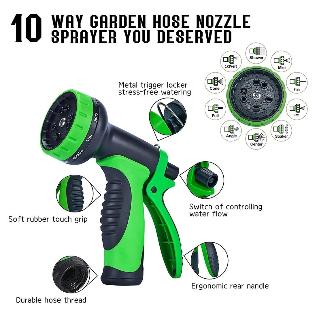 Detailed Information About The Product:[10 FUNCTIONAL SAFETY NOZZLE]: Compared to most 8/9 pattern hose nozzle, our water nozzle with 10 pattern for more choices. The rubberized outer coating is non-slip and comfortable. Rotating bezel for easy choosing kind of nozzle. Buckle stent for uninterrupted use. Ergonomic handgrip for effortless operation.