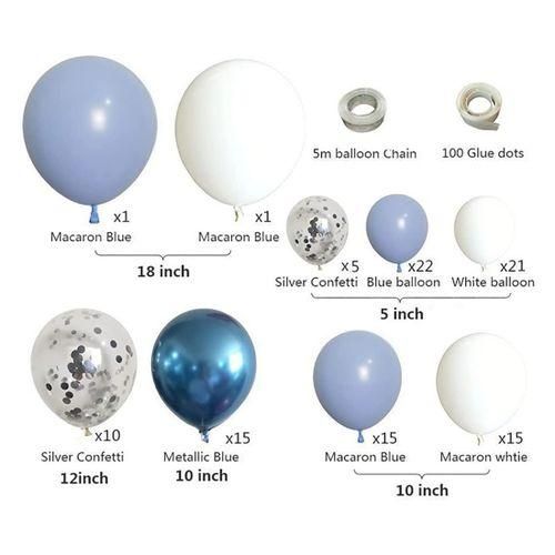 Detailed information about the product:Blue Balloon Arch: Baby blue balloon arch perfect for baby or boy birthday party balloons decoration, blue balloon can make balloon arches and garland, and make party arrangement look fresh and grace.