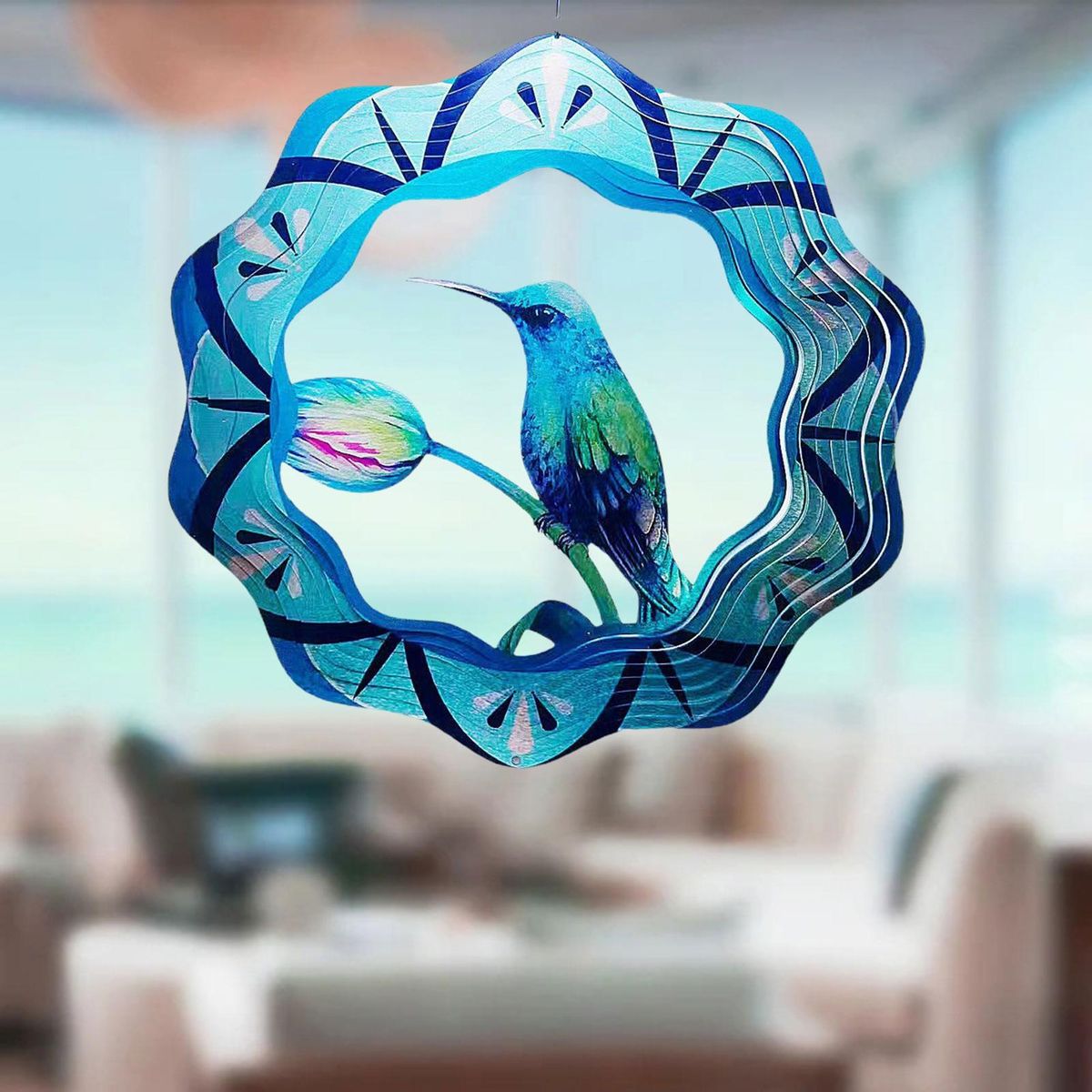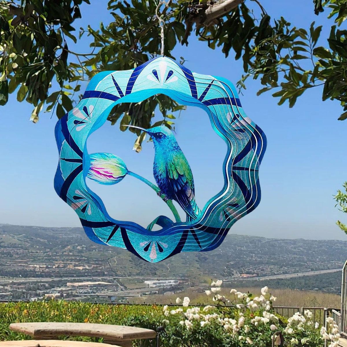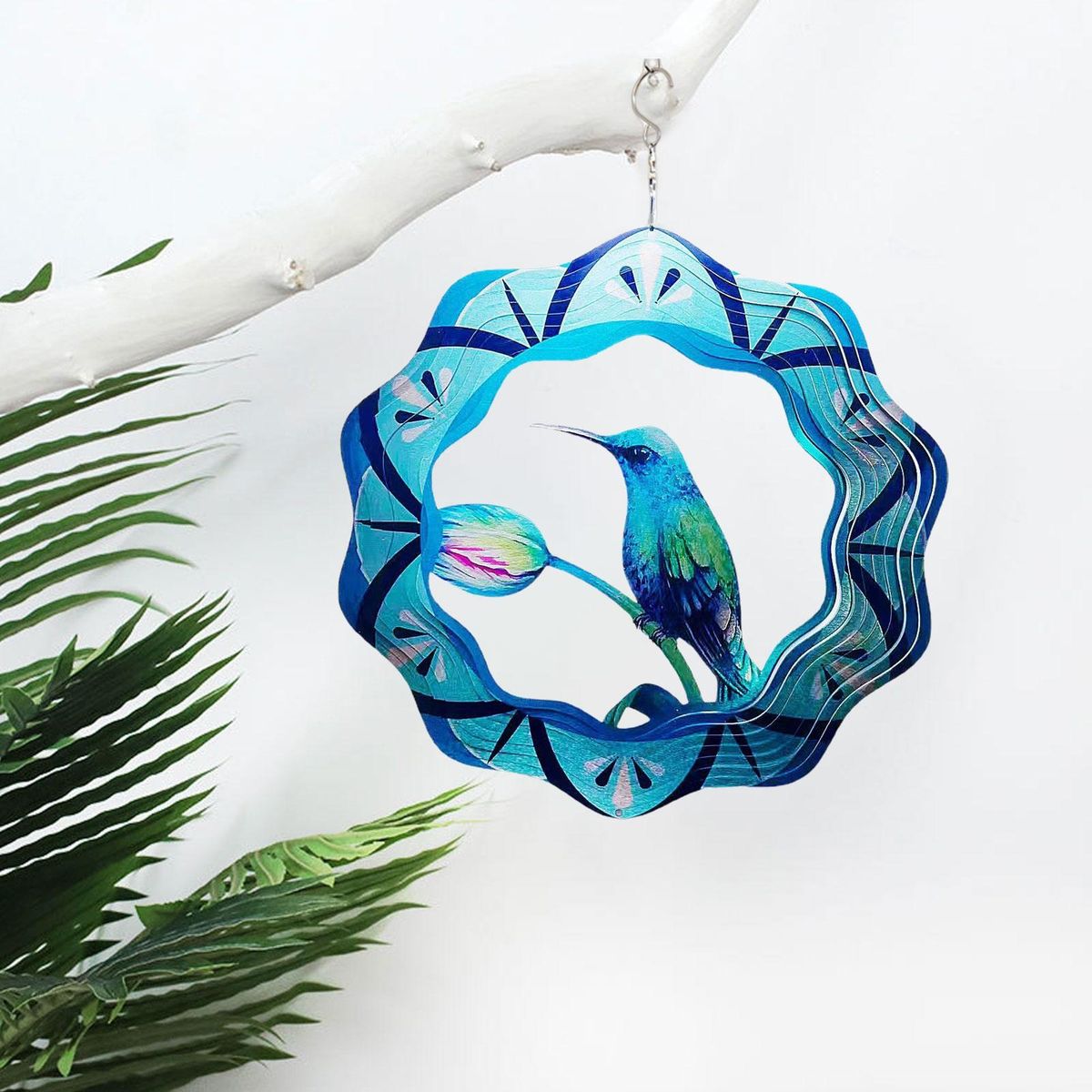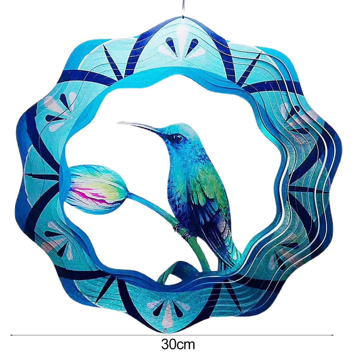 The highlight of this wind chime is the 3d hummingbird design. it vividly depicts a tropical hummingbird collecting nectar from wildflowers and flying freely in the forest. the intricate details and exquisite cutting of the wind spinner create a mesmerizing visual effect when it spins.
