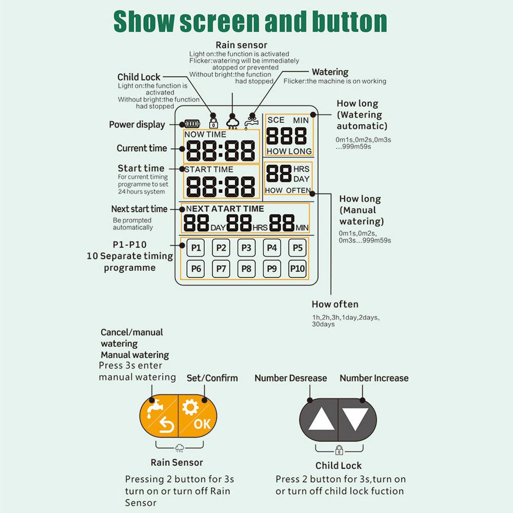 Safety Lock Mode: Introduced to open the interface lock function, to prevents people from pressing or mistakenly touching it to prevents abnormal watering.