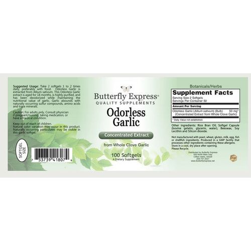 Odorless Garlic softgels provide you with the goodness of pure garlic oil, minus the unpleasant aftertaste. Garlics history traces back to A.D. 510 in ancient China. Garlic has been traditionally used for its antioxidant properties, as well as to help support heart and cardiovascular health.* Sundown Naturals Odorless Garlic softgels undergo a specialized cold processing method, which preserves the natural goodness of garlic while reducing the odor.-Disclaimers: ‡Clean defined as all products non-GMOˆ, and free of gluten, wheat, dairy, lactose and artificial flavors. ˆApplies to all products manufactured after 3/1/17. *These statements have not been evaluated by the Food and Drug Administration. This product is not intended to diagnose, treat, cure or prevent any disease. †Traditional use claims are based on historical or traditional practices. Garlic has been traditionally used for cardiovascular health, as recorded in ancient Roman and Ayurvedic texts.