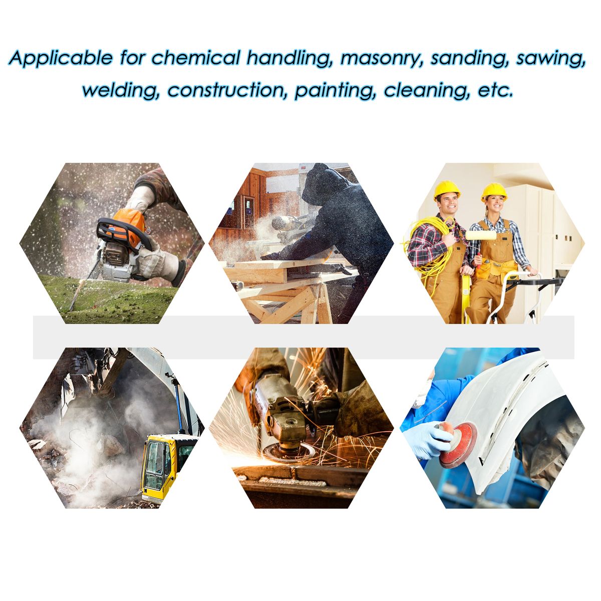 Applicable for chemical handling, masonry, sanding, sawing, welding, construction, painting, cleaning, etc.