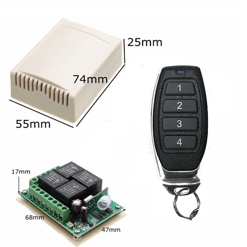 Papackage contains1 x 110~220V 4Channel Switch Receiver (with cover)1 x 4Key Remote Control Transmitter (Included 23A Batteries For Controller)