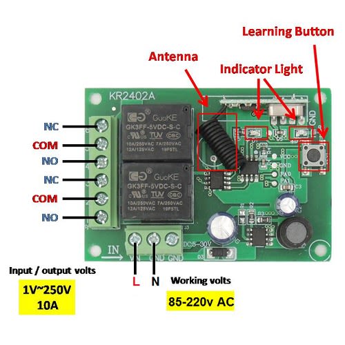 4-channel ReceiverDecode: Learning codeWorking Voltage: 110V~220VOutput way: Momentary/Toggle Latched AdjustableMaximum Load Current: 10ARelay Load:10A 1V-250V 10A/250V AC, 10A/125V AC, 10A/30V DC, 10A/28V DCReceiver Sensitivity: -107dBmWorking temperature : -40\'C - +70\'CSize: 8.8*6*3 CM