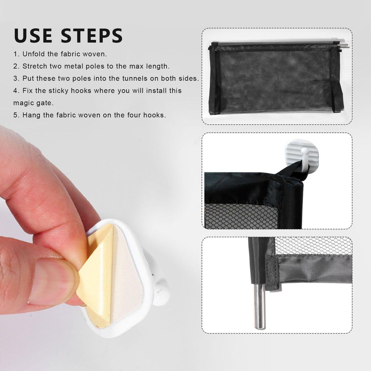 Unique woven that the gate portable folding mesh gate retracts to fully or partially quick pass-through When not in use you can fold it and anywhere you it also takes no space Warm Tips We do not recommend using sticky hooks directly You can use it on wooden posts or tiles
