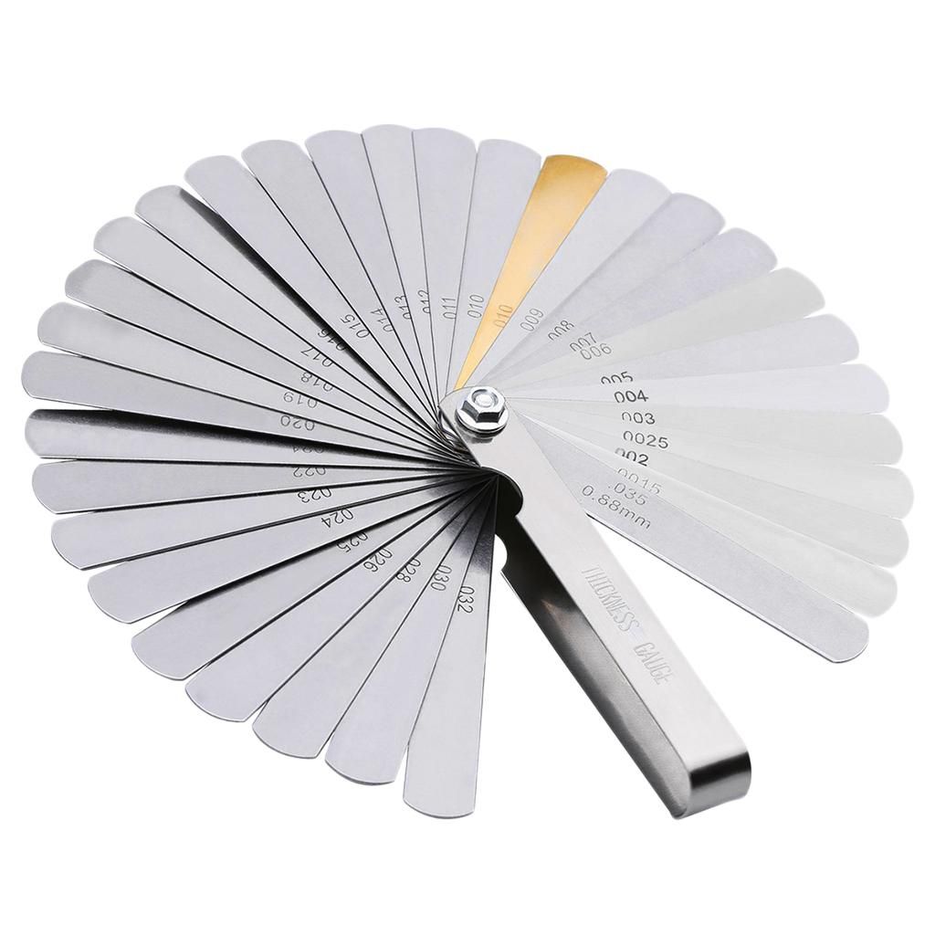 PRECISION MEASUREMENT: 32 Feeler Gauge: 32 hardened, tempered steel , measurement from 0.0015 inch (0.038 mm) to inch (9 mm), it is a guitar common spacing distance measure tool, chrome main shaft for easy to clean up and professional look.
