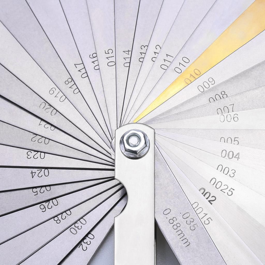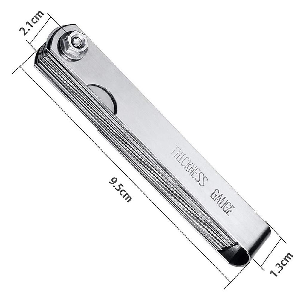 PRECISION MEASUREMENT: 32 Feeler Gauge: 32 hardened, tempered steel , measurement from 0.0015 inch (0.038 mm) to 0.035 inch (0.889 mm), it is a guitar common spacing distance measure tool, chrome plated main shaft for easy clean up and professional look.