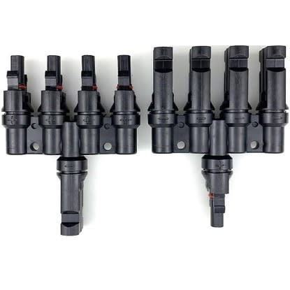 Set of MC4 T branch 4 to 1 solar connectors (male + female) for installing solar cables with cores 2.5 to 6 mm.Solar photovoltaic module cable connector, the connector uses inner drum spring, male and female connector and component junction box connector with the use of PPO material, the connector has anti-aging, uv resistance, meet the requirements of the power station in bad conditions.MC4 connector is specifically designed for connecting photovoltaic solar systems with high mechanical requirements and extreme weather conditions. For permanent installations.Name - MC4 solar connectorRated current - (4mm-25A, 6mm-30A)Rated voltage - 1000VDC