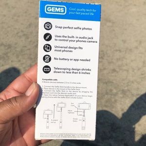 Gems Express Your Selfie - Selfie Stick with Shutter Button, Extends 16 inches. Condition is New. Universal Design, No Battery Needed Compatible with mobile devices between 2.5 to 3 inches wide. Extendable Wired Selfie Stick for all android phones and iPhone . it works with iPhone 4, iphone4s, iphone5,iphone 5s,iphone 5c, iphone6, iphone6s,iphone 6 plus,iphone6splus ,iPhone 6 plus and all android devices like samsung, infinx , techno, Etc..100% new and high quality